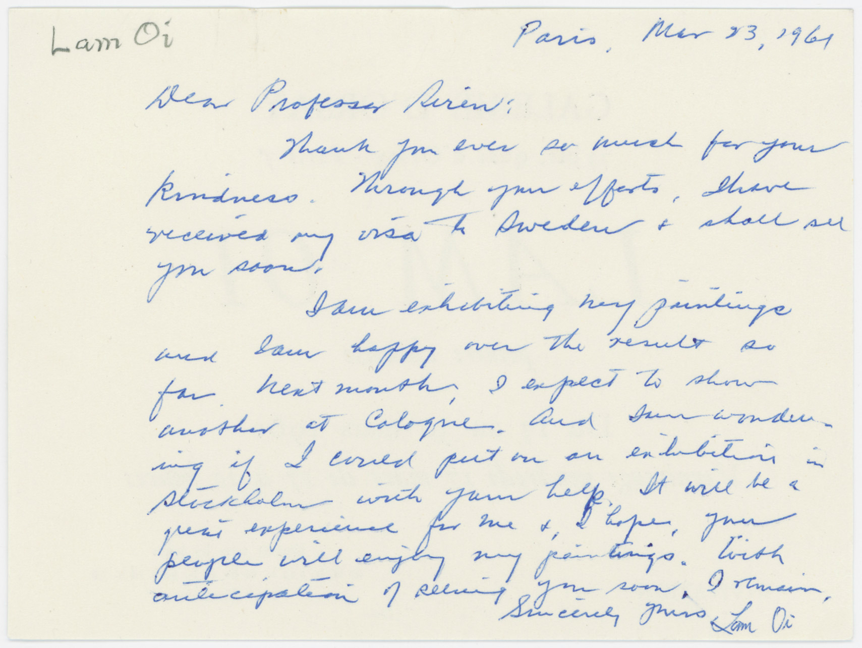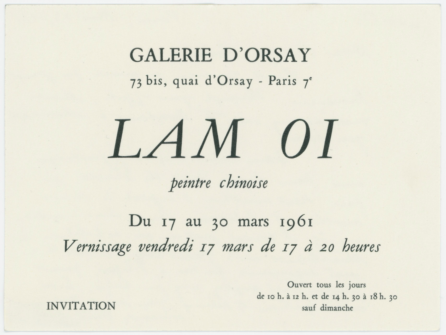 • Inbjudan till utställning på Galerie D´Orsay i Paris, Lam Oi, 17-30 mars 1961. Handskriven hälsning på baksidan av kortet.