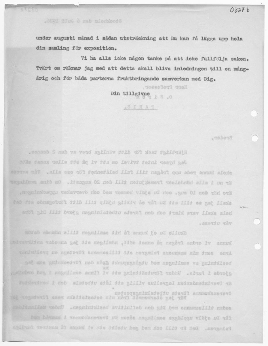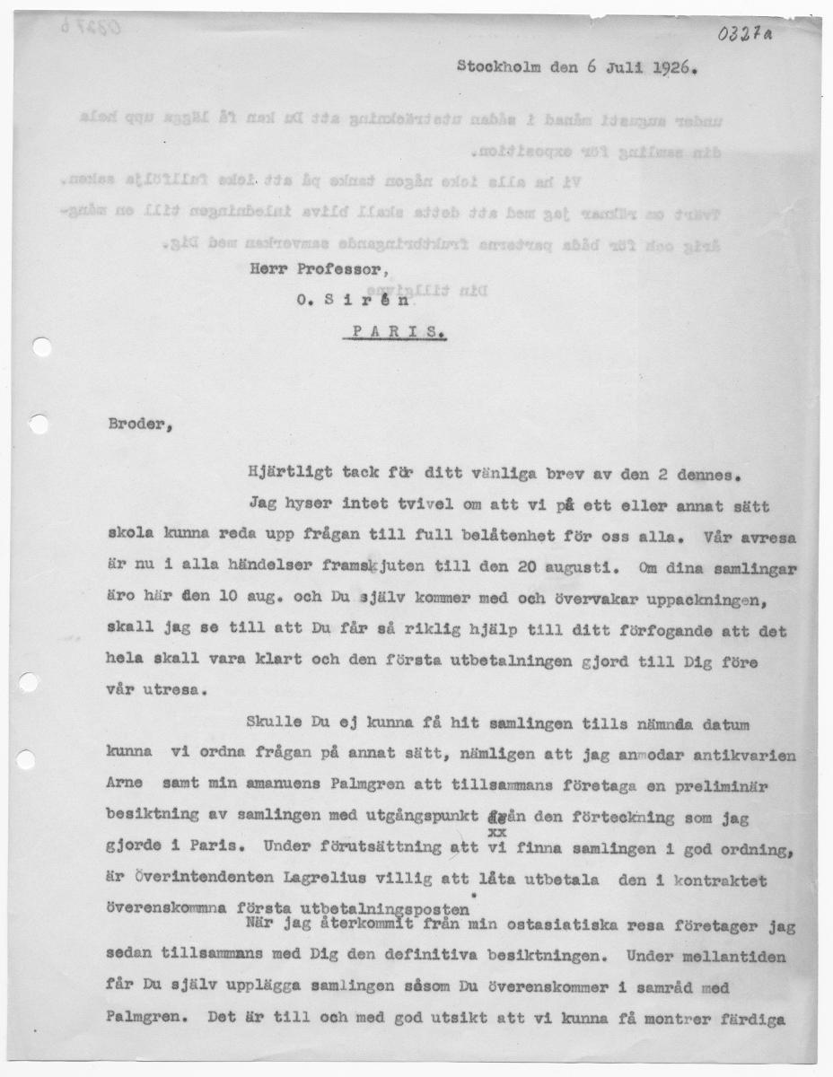 Fr Stockholm den 6 Juli 1926. Herr Professor, 0o.8Sir&n DLARISA Broder, Hjärtligt tack för ditt vänliga brev av den 2 dennes. Jag hyser intet tvivel om att vi på ett eller annat sätt skola kunna reda upp frågan till full belåtenhet för oss alla, Vår avresa är nu i alla händelser framskjuten till den 20 augusti, Om dina samlingar äro här den 10 aug. och Du själv kommer med och övervakar uppackningen, skall jag 8e till att Du får så riklig hjälp till ditt förfogande att det hela skall vara klart och den första utbetalningen gjord till Dig före vår utresa. Skulle Du ej kunna få hit samlingen tills nämnda datum kunna vi oråna frågan på annat sätt, nämligen att jag anmodar antikvarien S SUNNE FATENISRNEN Arne samt min amanuens Palmgren att tillsammans företaga en preliminär å besiktning av samlingen med utgångspunkt fgån den förteekning som jag i gjorde 1 Paris, Under förutsättning att vå finna samlingen i god ordning, är Överintendenten Lagrelius villig att Jaga utbetala den 1 kontraktet överenskommna första utbetalningspos skom När jag återkommit från min ostasiatiska resa företager jag sedan tillsammans med Dig den definitiva besiktningen. Under mellantiden får Du själv upplägga samlingen såsom Du överenskommer 1 samråd med Palmgren. Det är till och med god utsikt att vi kunna få montrer färdiga Mila DE D FRK Jr MA NRA ENS