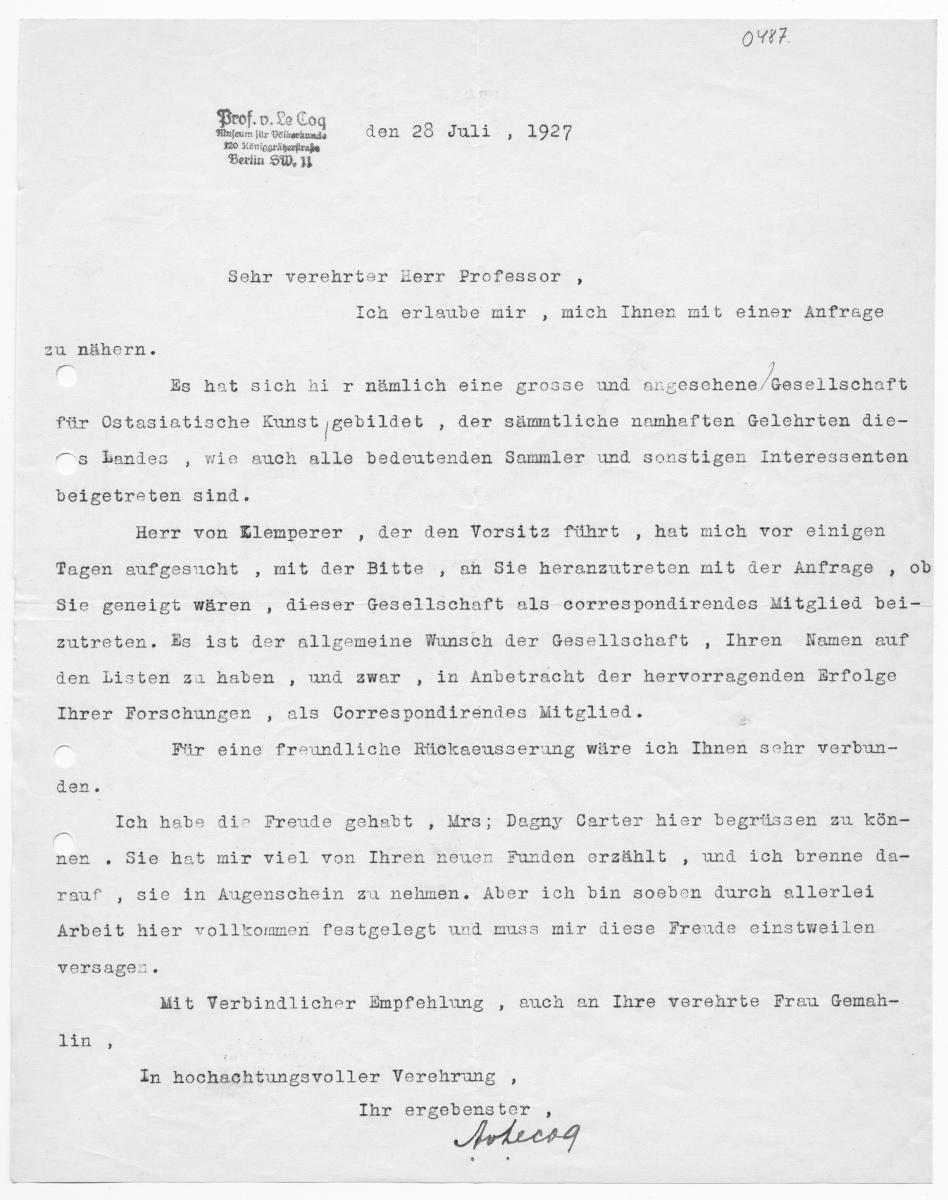 OM? vof.v. Le C cof.D.To Coq den 28 Juli , 1927 220 Königgrägerfivafe Berlin SW, 13 Sekr verehrter Herr Professor , Ich erlaube mir , mich Ihnen mit einer Aunfrage 2 nähern. ö RE SR RA SKE SE | : Es hat sich hi r nämlich eine grosse und argesehene/Gesellschaft fär Ostasiatische smed Lr , der sämmtliche namhaften Gelehrten die- Os bBandes , wie auch alle bedeutenden Sammler und sonstigen Interessenten beigetreten sind. Herr von Klemperer , der den Vorsitz fährt , hat mich vor einigen Tagen aufgesucht , mit der Bitte , ah Sie heranzutreten mit der Anfrage , ob Sie geneigt wären , dieser Gesellschaft äte correspondirendes Mitglied bei- zutreten. Es ist der allgemeine Wunsch der Gesellschaft , Ihren Namen auf den Lister zu haben , und zwar , in Anbetracht der hervorragenden Erfolge Ihrer Forschungen , als Correspondirendes Mitglied. Fir eine freundliche Riäickaeusserung wäre ich Ihnen sehr verbun- Ieh habe die Freude gehabt , Mrs; Dagny Carter hier begrässen au kön- nen . Sie hat mir viel von Ihren neuen Funden ergählt , und ich brenne da- rauf , sie in Augenschein zu nelimen. Aber ich bin soeben durch allerlei Arbeit hier vollkommen festgelegt und muss mir diese Freude einstweilen versagen . Mit Verbindlicher Empfehlung , auch an Ihre verehrte Frau Gemah- GG In hochachtungsvoller Verehrung , Ihr ergebenster ,