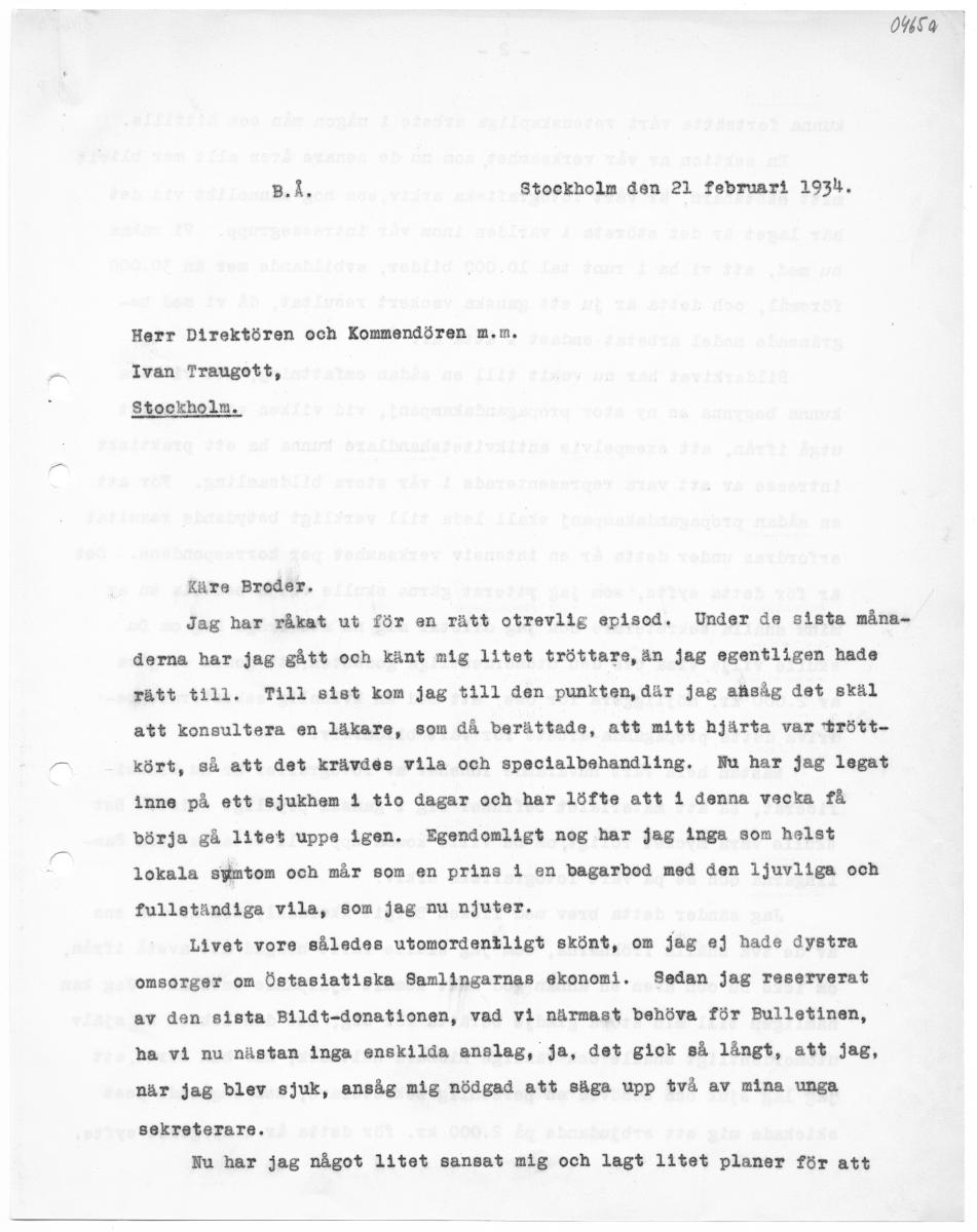 OWSa | B.Å, Stockholm den 21 februari 1934. Herr Direktören och Kommendören m.m. Ivan Traugott, Stockholm. käre Broder. Jag har råkat ut för en rätt otrevlig episod. Under de sista måna- derna har jag gått och känt mig litet tröttare, än jag egentligen hade rätt till. Till sist kom jag till den punkten, där jag ansåg det skäl att konsultera en läkare, som då berättade, att mitt hjärta var trött. kört, så att det krävdes vila och specialbehandling, Nu har jag legat inne på ett sjukhem 1 tio dagar och har löfte att i denna vecka få börja gå litet uppe igen. Egendomligt nog har jag inga som helst lokala symtom och mår som en prins i en bagarbod med den 1juvliga och fullständiga vila, som jag nu njuter. Livet vore således utomordentligt skönt, om jag ej hade dystra omsorger om Östasiatiska Samlingarnas ekonomi. Sedan jag reserverat av den sista Bildt-donationen, vad vi närmast behöva för Bulletinen, ha vi nu nästan inga enskilda anslag, ja, det gick så långt, att jag, när jag blev sjuk, ansåg mig nödgad att säga upp två av mina unga sekreterare. Nu har jag något litet sansat mig och lagt litet planer för att