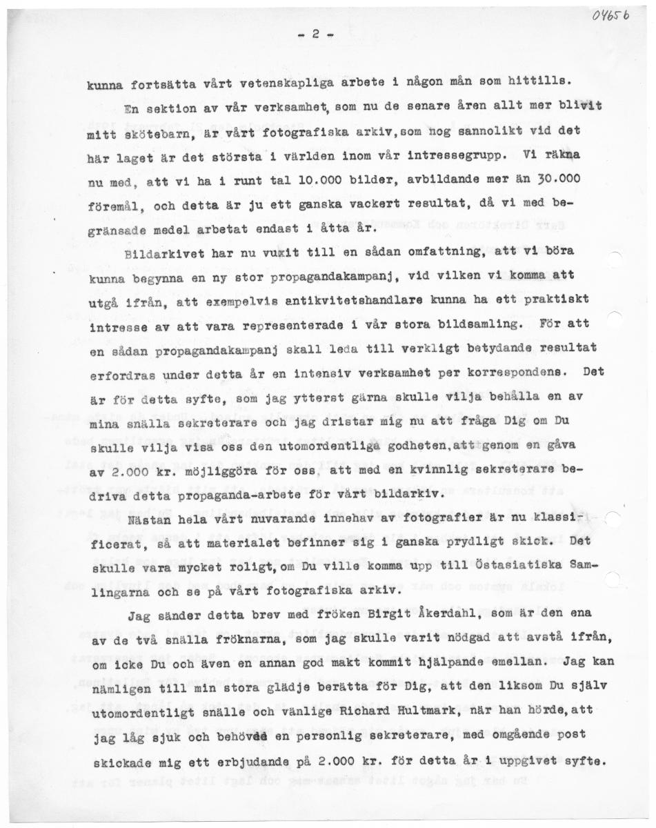 OY65b 2» kunna fortsätta vårt vetenskapliga arbete i någon mån som hittills. tn sektion av vår verksamhet, som nu de senare åren allt mer blivit mitt skötebarn, är vårt fotografiska arkiv,som nog sannolikt vid det här laget är det största i världen inom vår intressegrupp. Vi räkna nu med, att vi ha i runt tal 10.000 bilder, avbildande mer än 30.000 föremål, och detta är ju ett ganska vackert resultat, då vi med be- gränsade medel arbetat endast i åtta år. Bildarkivet har nu vuxit till en sådan omfattning, att vi böra < kunna begynna en ny stor propagandakampanj, vid vilken vi komma att utgå ifrån, att exempelvis antikvitetshandlare kunna ha ett praktiskt intresse av att vara representerade i vår stora bildsamling. För att en sådan propagandakampanj skall leda till verkligt betydande resultat erfordras under detta år en intensiv verksamhet per korrespondens. Det är för detta syfte, som jag ytterst gärna skulle vilja behålla en av mina snälla sekreterare och jag dristar mig nu att fråga Dig om Du skulle vilja visa oss den utomordentliga godheten,att genom en gåva av 2.000 kr. möjliggöra för oss, att med en kvinnlig sekreterare be- åriva detta propaganda-arbete för värt bildarkiv, Nästan hela vårt nuvarande innehav av fotografier är nu klassi- ficerat, så att materialet befinner sig i ganska prydligt skick. Det skulle vara mycket roligt, om Du ville komma upp till Östasiatiska Sam. lingarna och se på vårt fotografiska arkiv. Jag sänder detta brev med fröken Birgit Åkerdahl, som är den ena av de två snälla fröknarna, som jag skulle varit nödgad att avstå ifrån, om icke Du och även en annan god makt kommit hjälpande emellan. Jag kan nämligen till min stora glädje berätta för Dig, att den liksom Du själv utomordentligt snälle och vänlige Richard Hultmark, när han hörde, att jag låg sjuk och behövdé en personlig sekreterare, med omgående post skickade mig ett erbjudande på 2.000 kr. för detta år i uppgivet syfte.