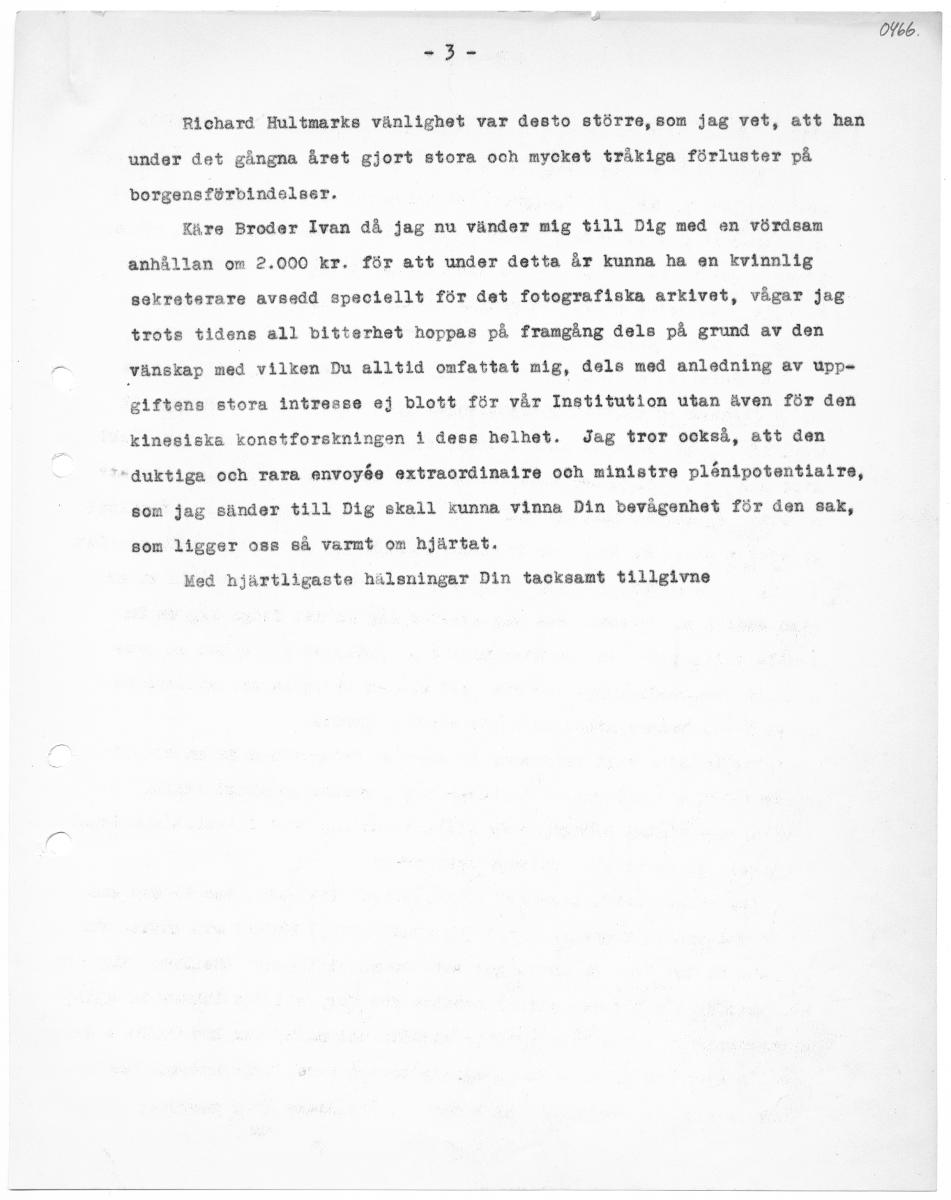 oY6b. Richard Hultmarks vänlighet var desto större, som jag vet, att han under det gångna året gjort stora och mycket tråkiga förluster på borgensförbindelser. Käre Broder Ivan då jag nu vänder mig till Dig med en vördsam anhållan om 2.000 kr. för att under detta år kunna ha en kvinnlig sekreterare avsedd speciellt för det fotografiska arkivet, vågar jag trots tidens all bitterhet hoppas på framgång dels på grund av den vänskap med vilken Du alltid omfattat mig, dels med anledning av upp+ giftens stora intresse ej blott för vår Institution utan även för den kinesiska konstforskningen 1 dese& helhet. Jag tror också, att den "duktiga och rara envoyåe extraordinaire och ministre plånipotentiaire, som jag sänder till Dig skall kunna vinna Din bevågenhet för den sak, som ligger oss så varmt om hjärtat. Med hjärtligaste hälsningar Din tacksamt tillgivne