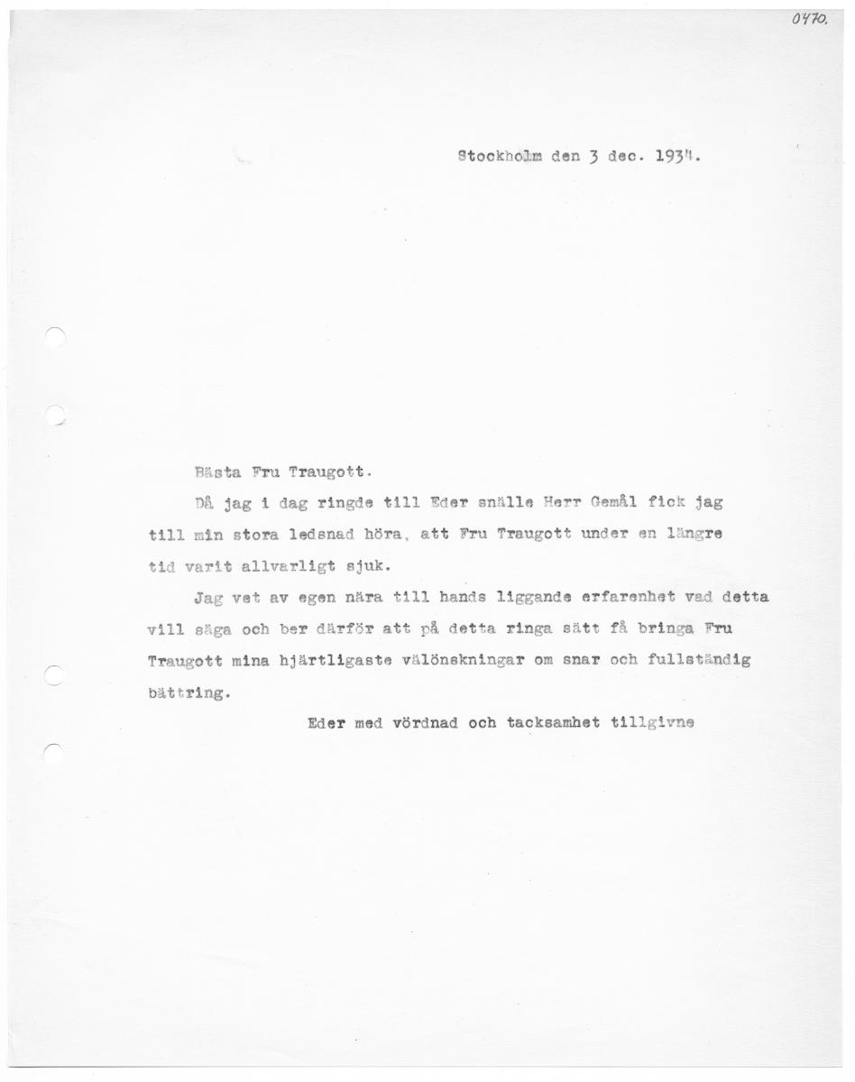 0470, Stockholm den 3 dec. 1931. Bästa Fru Traugott. DÅ jag 1 dag ringde till Eder snälle Herr Gemål fick jag till min stora ledsnad höra, att Fru Traugott under en längre tid varit allvarligt sjuk. Jag vet av egen nära till hands liggande erfarenhet vad detta vill säga och ber därför att på detta ringa sätt få bringa Fru Traugott mina hjärtligaste välönskningar om snar och fullständig bättring. Eder med vördnad och tacksamhet tillgivneStäng