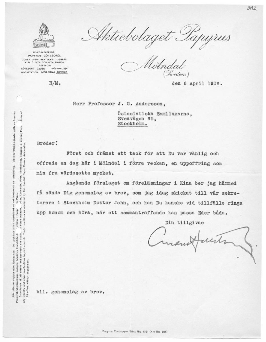 DM, 2 Allibolaget Dpyrus snön, MÖLNDAL NEDRE. = (Löeden:) E/M. den 6 April 19536. Herr Professor J. G. Andersson, Östasiatiska Samlingarna, Sveavägen 65, Stockholm, Broder? Först och främst ett tack för att Du var vänlig och offrade en dag här i Mölndal i förra vecken, en uppoffring som min fru värdesatte mycket. Angående förslaget om föreläsningar i Kina ber jag härmed få sände Dig genomslag av brev, som jag idag skicket till vår sekre- terare i Stockholm Doktor Jahn, och kan Du kanske vid tillfälle ringa sektionsbeslut om priskndring. Vid alla försäljningsavtai gälla av Sveneka upp honom och höra, när ett sammanträffande kan passa Båer båda. Din tillgiwme bil. genomslag av brev. Föpyrvs Postpopper Stim Nio 4081 (4: N:o 381)