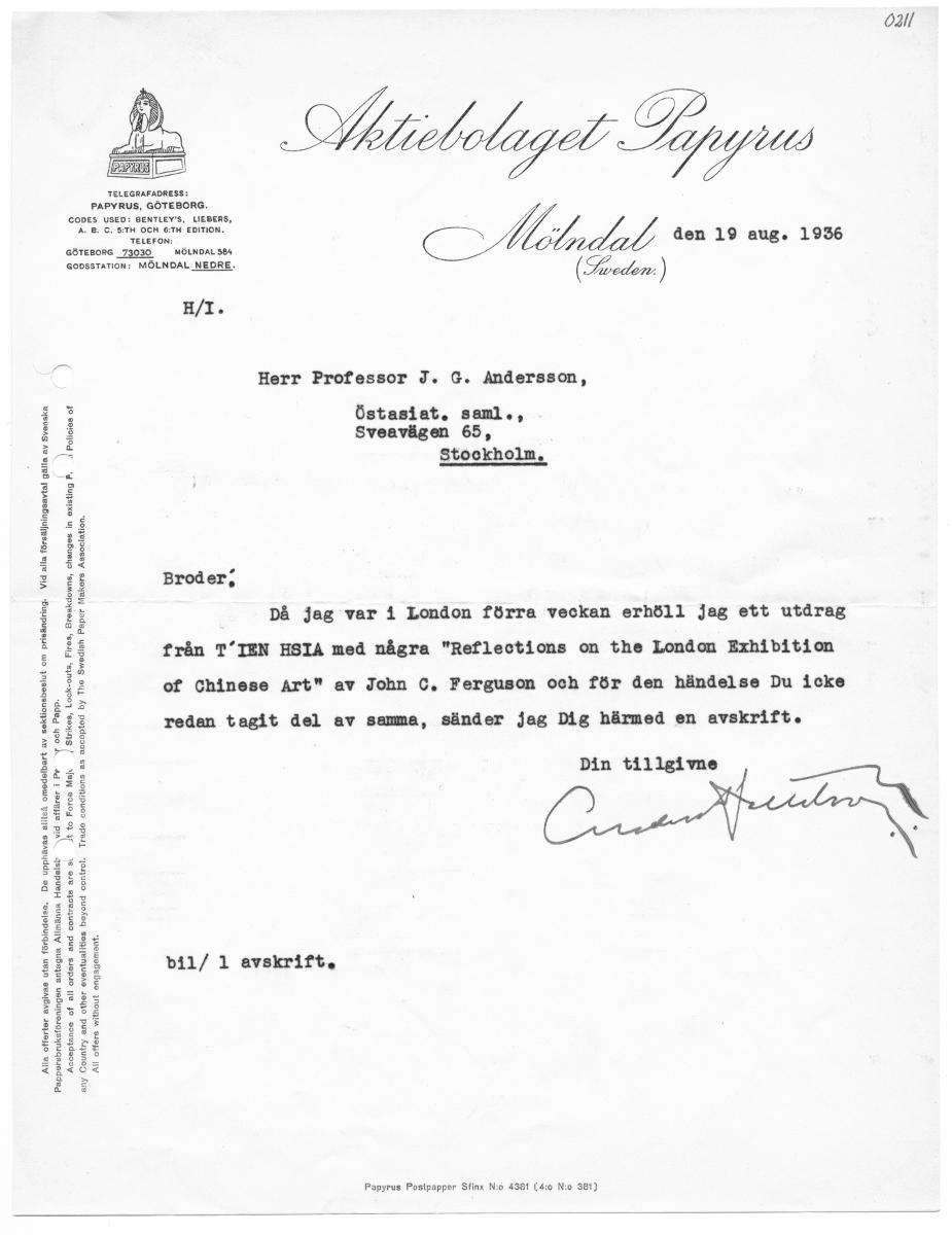 O3ll AÅltibolagdt Duo FA EE nan, Mö 2 Gedda 108 19 aug. 1936 Goossration; MÖLNDAL NEDRE. (Leden) PAPYRUS, GÖTEBORG. B/1. Herr Professor J. G. Andersson, Östasiat. saml., Sveavägen 65, stockholm, Broder; Då jag var i London förra veckan erhöll jag ett utdrag från T'IEN HSIA med några "Reflections on the London Exhibition of Chinese Art" av John C. Ferguson och för den händelse Du icke reden tagit del av samma, sänder jag Dig härmed en avskrift. Din tillgimne RER 16, Broakiouna, ohanges in medekert ev soktlomsbelet om priskndetng.. Vid. bil/ 1 avskrift. Papyrus Postgopper Sfinx N:o 4381 (40 Nio 381)