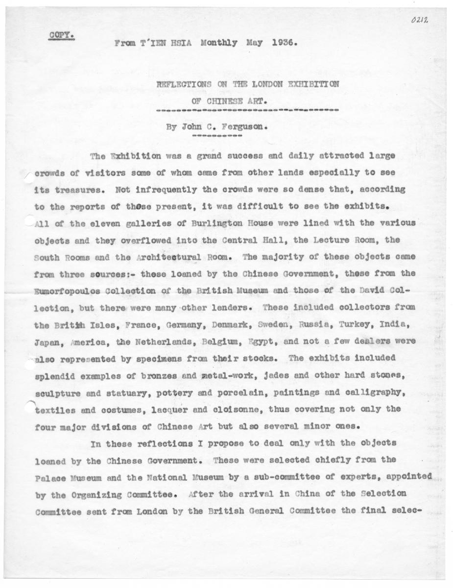 OUR z From T'IEN HSIA Monthly May 1936. REFLECTIONS ON THE LONDON EXHIBITION OF CHINESE ART. By John C. Ferguson. The Exhibition was a grand succ: end datly attracted large orowda of visitors some of whom came from other lands especially to see 41ts treasures. Not infrequently the crowds were so dense that, according to the reports of those present, it was difficult to see the exhibits. All of the eleven galleries of Burlington House were lined with the various objects and they overflowed into the Central Hall, the Lecture Room, the south Rooms and the Architestural Room. The majority of these objects came from three sources:- these loaned by the Chinese Government, these from the Eumorfopoulos Collection of the British Museum and those of the David Col- leotion, but there were many other lenders. These included collectors from the Britth Isles, France, Germany, Denmark, Sweden, Russia, Turkey, India, Japan, /merioca, the Netherlands, Belgium, fgypt, and not a few denlers were also represented by specimens from their stocks. The exhibits included splendid examples of bronzes and metal-work, jades and other hard stones, sculpture and statuary, pottery end porcelsain, paintings and oelligraphy, ”Jezitlos and oostumes, lacquer and eloisonne, thus covering not only the four major äivistons of Chinese Art but also several minor ones. In thes: loaned by the Chinese Government. These were selected ohiefly from the Palace Museum and the National Museum by a sub-committee of experts, appointed dy the Orgenizing Committee. After the arrival in China of the Selection Committee sent from London by the British Generel Committee the final selec- reflections I propose to deal only with the objects