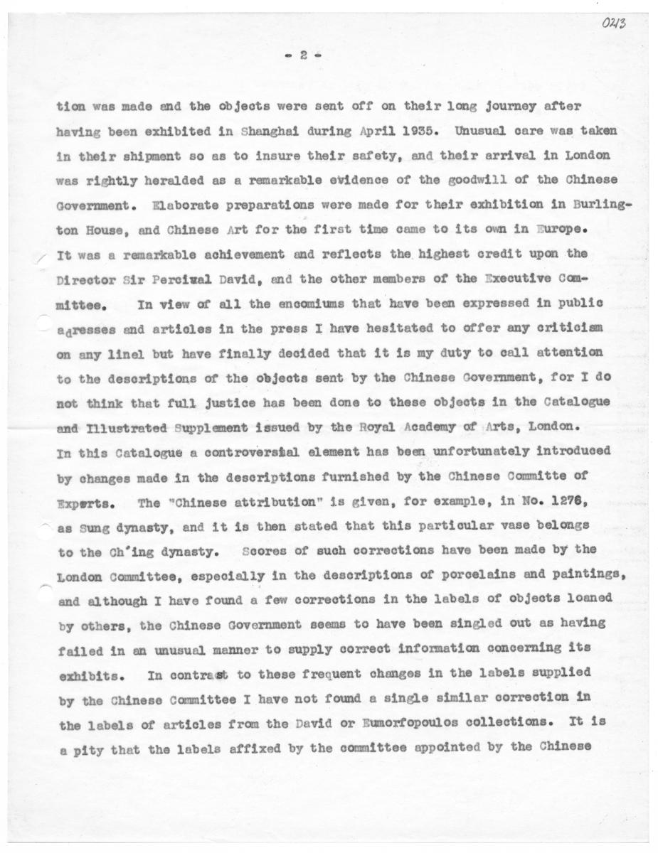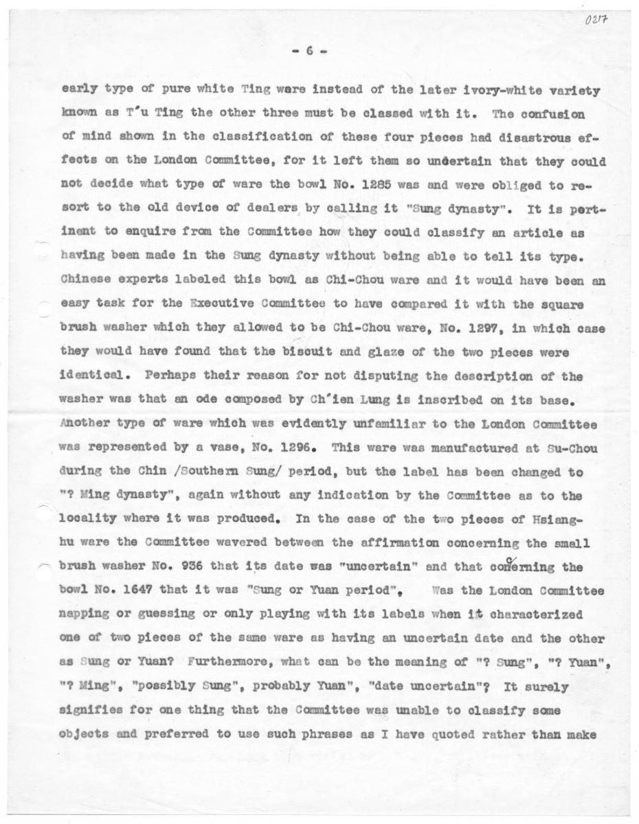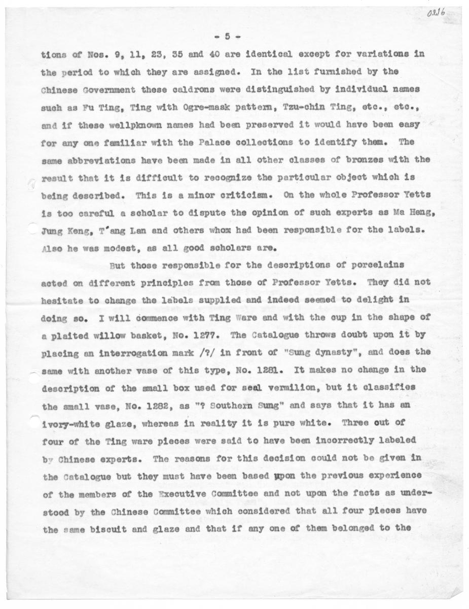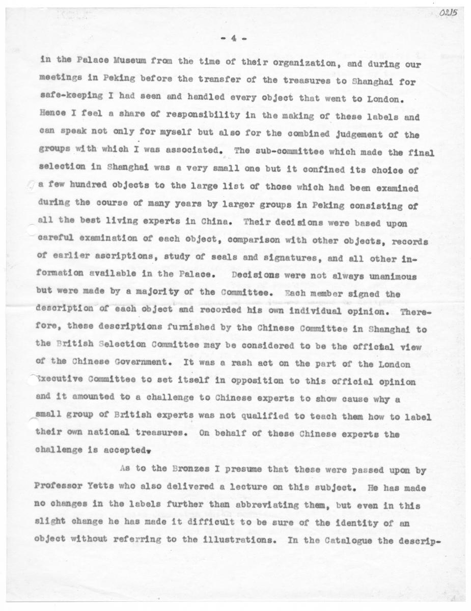OMS -4- in the Palace Museum from the time of their organization, and during our neetings in Peking before the transfer of the treasures to Shanghai for safe-koeping I had seen and handled every object that went to Lonåon. Hence I feel a share of responsibility in the making of these labels and can speak not only for myself but also for the combined Judgement of the groups with which I was associated, The sub-committee which made the finel selection in Shanghei was a very small one but it oonfined its choice of a few hundred objects to the large list of those which had been examined during the course of many years by larger groups in Peking oconsisting of ell the best living experts in China, Their deoisions were based upon careful examination of eech object, comparison with other objects, records of earlier ascriptions, study of seals and signatures, and all other in- formation available in the Palace. Decisions were not always unanimous but were made by a majority of the Committee. Jach member signed the Gesoription of each object and recorded his own individual opinion. There- fore, thé descriptions furnished by the Chinese Committee in Shanghat to the British selection Committee may be considered to be the offichal view of the Chinese Government. It was a rash act on the part of the London ”txecutive Committee to set itself in opposition to this official opinion end 1t amounted to a challenge to Chinese experts to show cause why a small group of British experts was not qualified to teach them how to label their own national tresasures. On behalf of these Chinese experts the challenge is acceptedve A8 to the Bronzes I presume that these were passed upon by He has made Professor Yetts who also delivered a lecture on this subj no changes in the labels further than abbreviating them, but even in this slieht change he has made it difficult to be sure of the identity of en object without referring to the illustrations, In the Catalogue the descrip-
