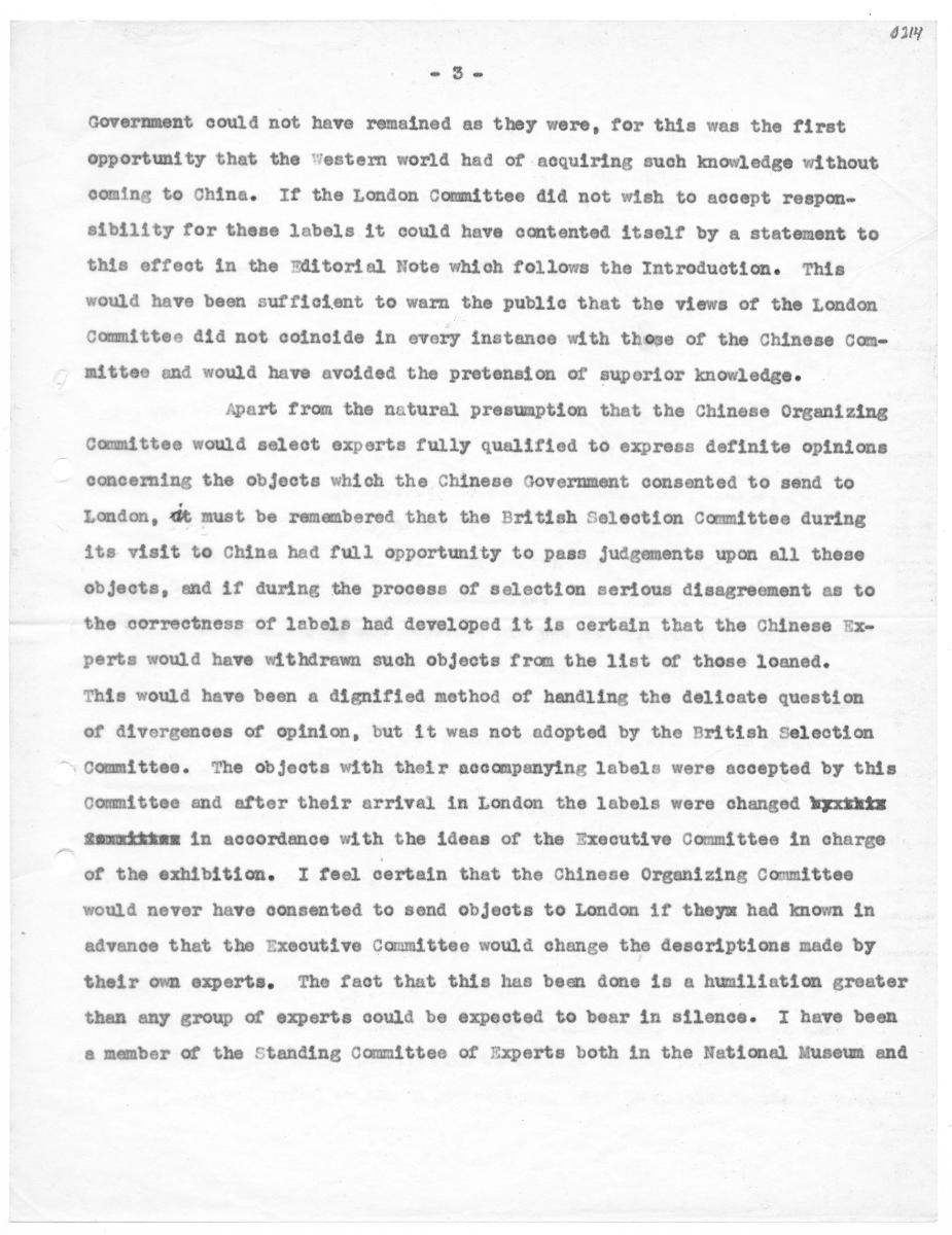 4304 Government could not have remained as they were, for this was the first opportunity that the western world had of acquiring such knowledge without coming to China. If the London Committee did not wish to accept respon- sibility for these labels it could have contented itself by a statement to this effect in the zätitorial Note which follows the Introduction. This would have been sufficient to warn the public that the views of the London Committes did not colnoide in every instance with those of the Chinese Com- mittee and would have avoided the pretension of superior knowledge. Apart from the natural presumption that the Chinese Organizing Committee would select experts fully qualified to express definite opinions concerning the objects which the Chinese Government consented to send to London, dt must be remembered thet the British Selection Committee during its visit to China had full opportunity to pass judgements upon all these objects, end if during the process of selection serious disagreement as to the correctness of labels had developed 1t is certaln that the Chinese Ex- perts would have withdrawn such objects from the list of those loaned. This would have been a dignified method of handling the delicate question of älivergenoes of opinion, but it was not adopted by the British Selection Committee. The objects with their accompanying labels were accepted by this oommittee and after their arrival in London the labels were changed kyxthix Saxxktter in accordance with the ideas of the Executive Committee in charge of the exhibition. I feel certain that the Chinese Organizing Committee would never have consented to send objects to London 1f theym had known in advance that the Exeoutive Committee would change the descriptions made by their own experts, The fact that this has been åone is a humiliation greater than any group of experts could be expected to bear in silence. I have been a member of the Standing Committee of Experts both in the National Museum and