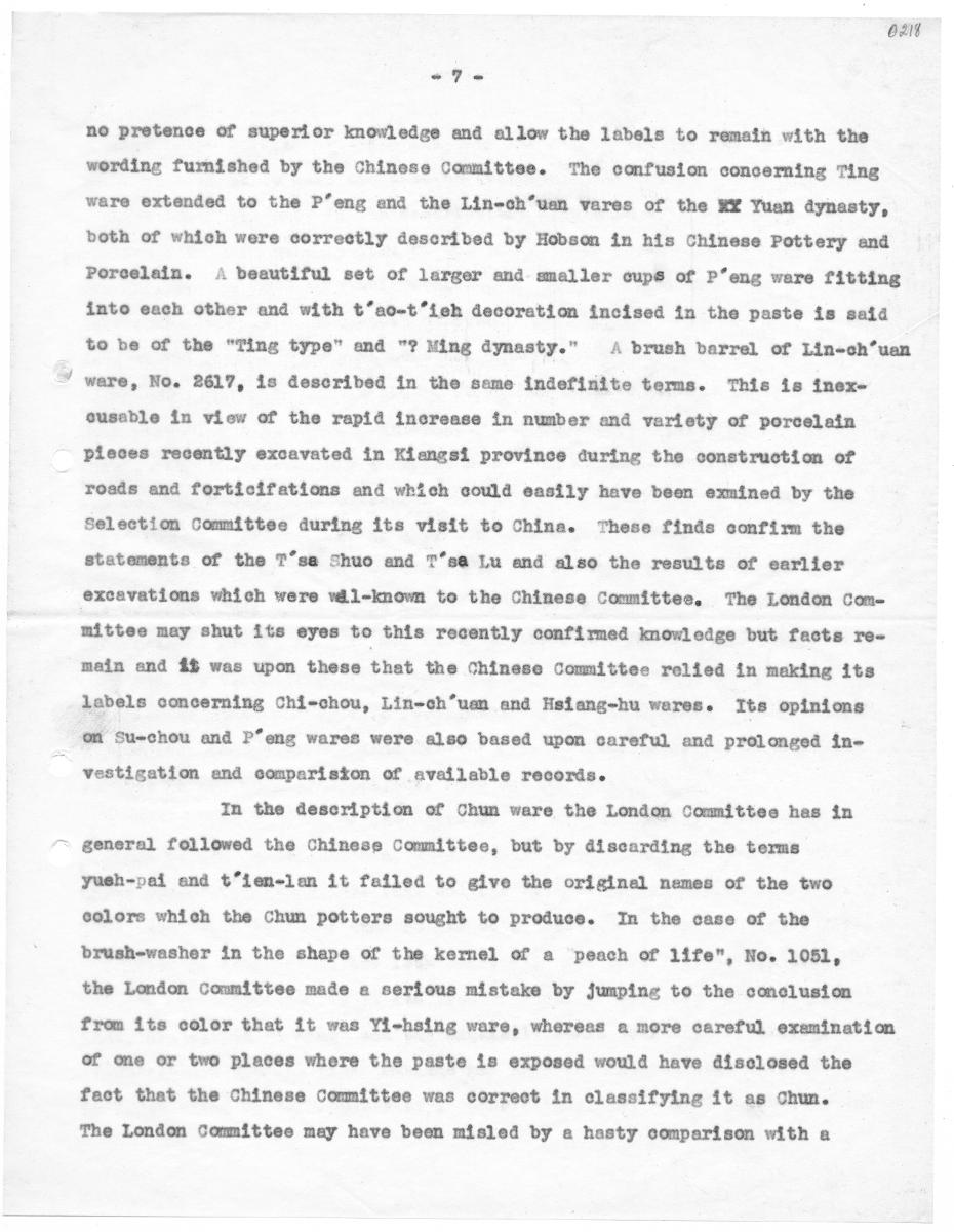 out -6=- early type of pure white Ting ware instead of the later ivory-white variety known as T”u Ting the other three must be olassed with it. The confusion of mind shown in the clessification of these four pieces had disastrous ef- fects on the London Committee, for it left them so ungertain that they could not decide what type of ware the bowl NO. 1285 was and were obliged to re- sort to the old device of dealers by calling it "Sung dynasty". It is port- inent to enquire from the Committee how they could classify an article as having been made in the Sung dynasty without being able to tell its type. Chinese experts labeled this bowl as Chi-Chou ware and it would have been an easy task for the Executive Committee to have compared it with the square brush washer which they allowed to be Chi-Chou ware, No, 1297, in which case they would have found that the bisocuit and glaze of the two pieces were identical. Perhaps their reason for not äisputing the desoription of the washer was that an ode composed by Ch”ien Lung is insoribed on its base, Another type of ware which was evidently unfamiliar to the London Committee was represented by a vase, No, 1296. This ware was menufactured at Su-Chou auring the Chin /southern Sung/ period, but the label has been changed to "2? Ming dynasty", again without any indication by the Committee as to the l00ality where it was produced, In the case of the two pieces of Hsiang- hu were the Committee wavered between the affirmation concerning the smell brush washer No. 936 that its date was "uncertain” and that coderning the bowl No. 1647 that it was ”Ssung or Yuan period”, Was the London Committee napping or guessing or only playing with its labels when 1t characterized one of two pieces of the same ware as having an uncertain date and the other as Sung or Yuan? Furthermore, what can be the meaning of "9? sung”, "? Yuan", "? Ming", "possibly Sung", probably Yuan", "date uncertain"? It surely signifies for one thing that the Committee was unable to olassify some objects and preferred to use such phrases as I have quoted rather than make