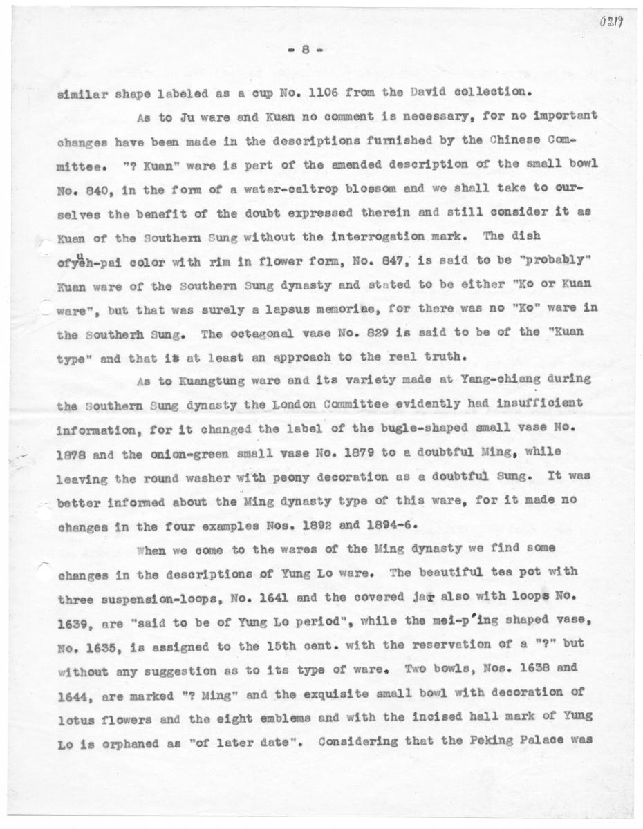 0220 -9- built by Yung Lo and that it contained a large collection of ware made during his reign it would appear probebly that the judgement of the Chinese committee as to this ware might be oonsidere...
