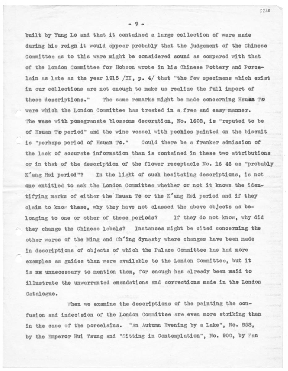 0220 -9- built by Yung Lo and that it contained a large collection of ware made during his reign it would appear probebly that the judgement of the Chinese committee as to this ware might be oonsidered sound as compared with that of the London Committee for Hobson wrote in his Chinese Pottery and Porce- lsain as late as the year 1915 /II, p. 4/ that "the few specimens which exist in our collections are not enough to make us realize the full import of these descriptions.” The same remarks might be made concerning Hsuan TO were which the London Committee has treated in a free and easy manner. The vase with pomegranate blossoms decoration, No. 1608, is ”reputed to be of Hsuan To period” and the wine vessel with peohies peinted on the biscuit 1s "perhaps period of Hsuan To.” Could there be a franker admission of the lack of accurate information than is contained in these two attributions or in that of the description of the flower receptacle No. 16 46 as "probably Kang Hsi perioå"? In the light of such hesitating descriptions, is not one entitled to ask the London Committee whether or not it knows the iden- tifylng marks of either the Hsuan To or the K”ang Hsi period and 1f they claim to know these, why they have not classed the above objects as be- longing to one or other of these periods? 1f they do not know, why did they change the Chinese labels? Instances might be cited concerning the other wares of the Ming and Ching dynasty where changes have been made in descriptions of objects of which the Palace Committee has had more examples as guides than were available to the London Committee, but it 1s xx unnecessary to mention them, for enough has already been maid to illustrate the unwarranted emendations and corrections made in the London Catalogue. when we examine the descriptions of the painting the con- fusion and indecision of the London Committee are even more striking than in the case of the poroelains. "An Autumn Evening by a Lake”, No. 858, by the Emperor Hui Tsung and "sitting in Contemplation”, No. 900, by Fen