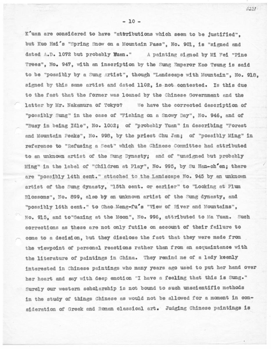 S22 - 10- K”uan are considered to have "atbributions which seem to be Justifieå”, but Kuo Hsi”s "Spring Snow on a Mountsin Pass", No. 901, is "signed and dated A.D. 1072 but probably Wuen .” A painting signed by Mi Fel "Pine Trees”, No. 947, with an inscription by the Sung Emperor Kao Tsung is said to be "possibly by a Sung Artist”, though "Landsospe with Mountain”, No. 918, signed by this same artist and dated 1102, is not contested. Is this due to the fact that the former was loaned by the Chinese Government and the letter by Mr. Nakamura of Tokyo? we have the corrected description of "possibly Sung” in the case of "Fishing on a Snowy Day", No. 946, and of "Busy in being Idle”, No. 1002; of "probably Yuan” in desoribing "Forest and Mountain Peaks", No. 998, by the priest Chu Jen; of "possibly Ming” in reference to "Refusing a Seat” which the Chinese Committee had attributed to an unknown artist of the sung Dynasty; and of "unsigned but probably Ming” in the lebel of ”Chilären at Play", No. 995, by Su Han-ch"en; there are "possibly l4th cent.” attached to the Landscape No. 945 by an unknown artist of the Sung dynasty, ”l5th cent. or earlier” to "Looking at Plum Blossoms”, No. 899, also by an unknown artist of the Sung dynesty, and "possibly 1l6th cent." to Chao Meng-fu”s "View of River and Mountains", No. 915, and to”Cazing at the Moon”, No. 996, attributed to Ma Yuan. Such corrections as these are not only futile on account of their failure to come to a decision, but they disclose the fact that they were made from the viewpoint of personal reactions rather than from an acquaintance with the literature of paintings in China. They remind me of a lady keenly interested in Chinese paintings who meny years ago used to put her hand over her heart and say with deep emotion "I have a feeling that this is Sung." Surely our western scholarship is not bound to such unsoientific methods in the study of things Chinese as would not be allowed for a moment in con= sideration of Creek and Romen elassicel art. Judging Chinese paintings is