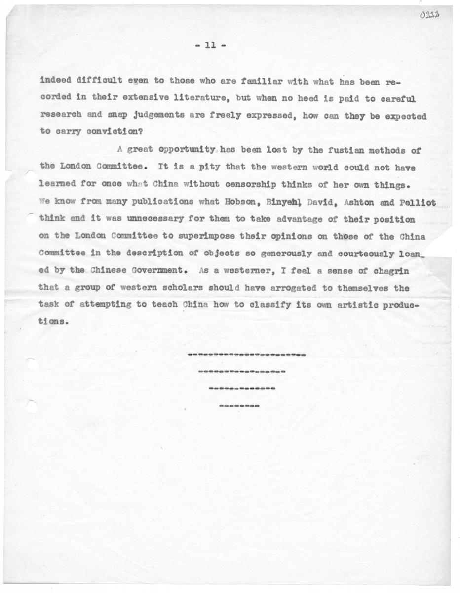 Öd2A . a indeed ätfficult even to those who are familiar with what has been re- corded in their extensive literature, but when no heed is paid to careful research and snep judgements sre freely expressed, how can they be expected to carry oonvietion? A great opportunity has been lost by the fustian methods of the London Committee. It is a pity that the western world could not have learned for once what China without censorship thinks of her own things. ve know from many publications what Hobson, Binyeh] David, Ashton and Pelliot think and it was unnecessary for them to take advantage of their position on the London Committee to superimpose their opinions on those of the China Committee in the description of objects so generously snd courteously loan. ed by the Chinese Covernment. As & westerner, I feel a sense of chagrin that a group of western scholers should have arrogated to themselves the task of attempting to teach China how to classify its om artistic produc- tions.