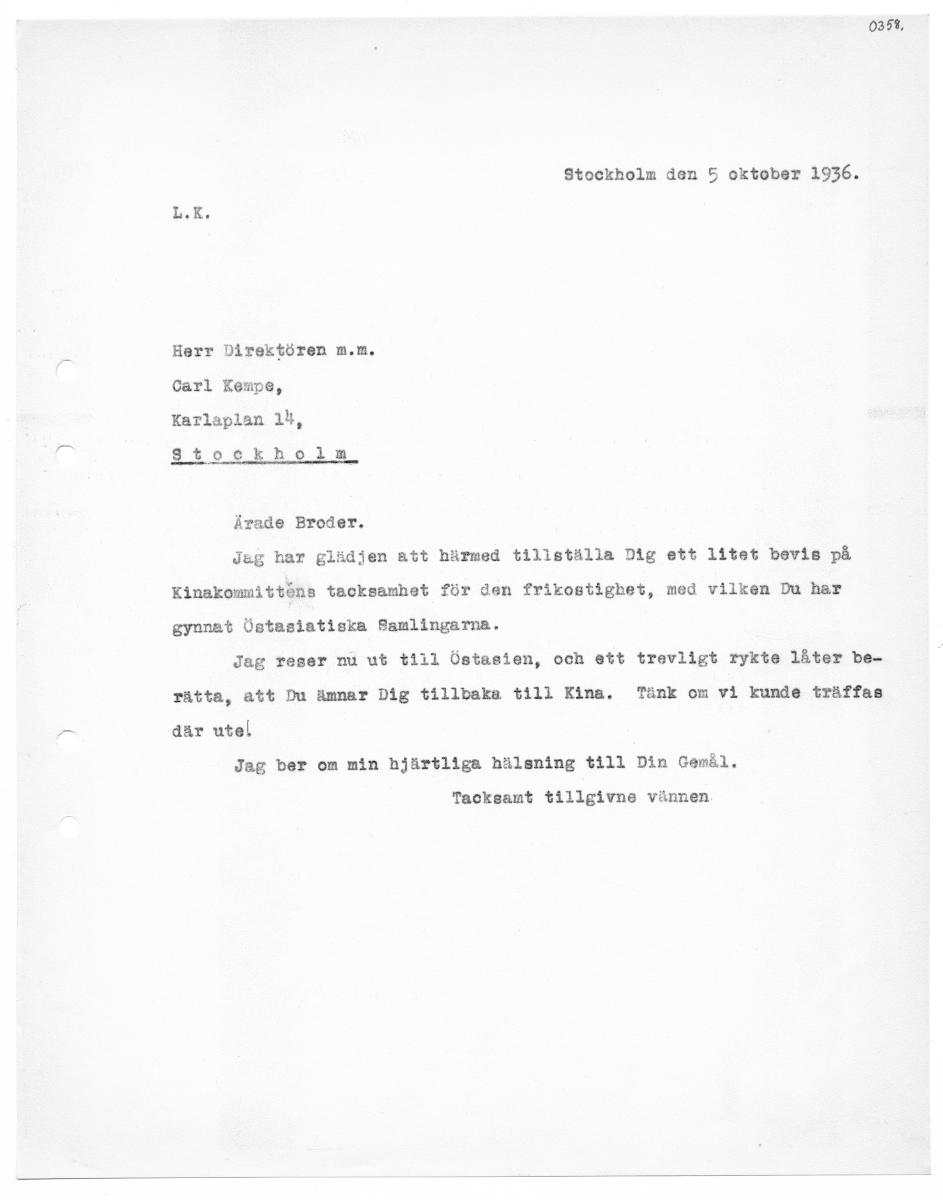 0351, Stockholm den 5 oktober 1936. Herr Direktören m.m. Carl Kempe, Karlaplan 14, stockhol Ärade Broder. Jag har glädjen att härmed tillställa Dig ett litet bevis på Kinakommittöns tacksamhet för den frikostighet, med vilken Du har gynnat Östasiatiska Samlingarna. Jag reser nu ut tiil Östasien, och ett trevligt rykte låter be- rätta, att Du ämnar Dig tillbaka till Kina. Tänk om vi kunde träffas d...