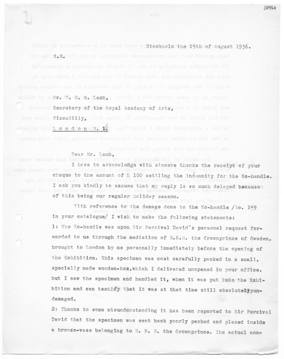 Stocknolm the 15th of August 1936. UP: We Be Me Tämby Secretary of the Royal Academy of Arts, Piccadilly, Desr Yr. Lamb, I have to acknowlsäge with sincere thenks the receipt ef your eheque to the amount of I 100 settling the indemnity for the Ko-handle. I esk you kindly to excuse that my reply is so much delayed because of this being our regular holiday season. vith reference to the damage åone to the Ko-handle /No. 159 in your cstalogue/ I wish to make the following statements: : The Xo-handle was upon Sir Percival David”s personal request for- warded to us through the mediation of H.R.i. the Crownprince of Sweden, brought to London by me personally immediately before the opening of the Exhibition. This specimen was most carefully packed in a small, specially made wooden-box,which I delivered unopened in your office, but I saw the specimen and handled 1t, when it was put into the Exhi- bition and oan testify that it was at that time still sbsolutetryun- damaged. 2: Thanks to some misunderstanding 1t has been reported to Sir Percival David thet the specimen was sent back poorly packed and placed inside 8 bronze-vase belonging to I. R. 5. the Crownprince. The actusl con-