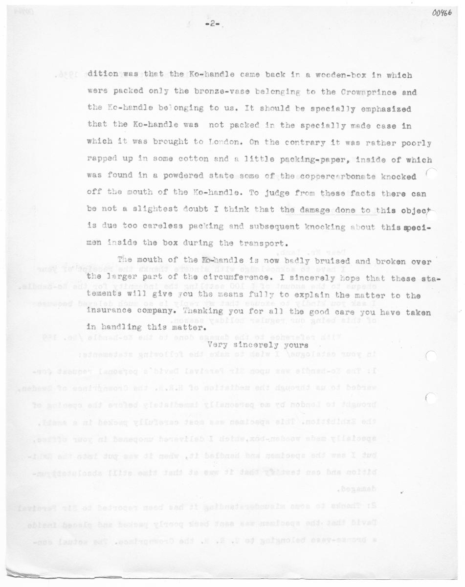 60466 -2- dition wes thet the Ko-han&le ceme back ir a wocden-box in which wers packed only the bronze-vase telenging to the Crownprince and the Ko-henäle belonging to us, It should be specially emphasized that the Ko-handle was not packed in the specially made case in which 1t was brought to Lordon. On the contrary it was rather poorly rapped up in some cotton and a little packing.psper, inside of which was found in a powdered state some of the copperesrbonote knocked | off tle mouth of the Ko-handle. To judge from these facts there can be not a slightest Aoubt I think that the damage done to this object is due too carelessa preking and subsequent knocking about thisspeci- mon inside the box during the transport. The mouth of the Föshandle 13 now bsdly bruised and broken over the larger part of tbe circumference. I sincerely topa that these sta- tements will give sou the resans fully to explain the matter to the insurance company. Tuenking you for all the good care you heve taken in handling this matter. Very sincerely yours