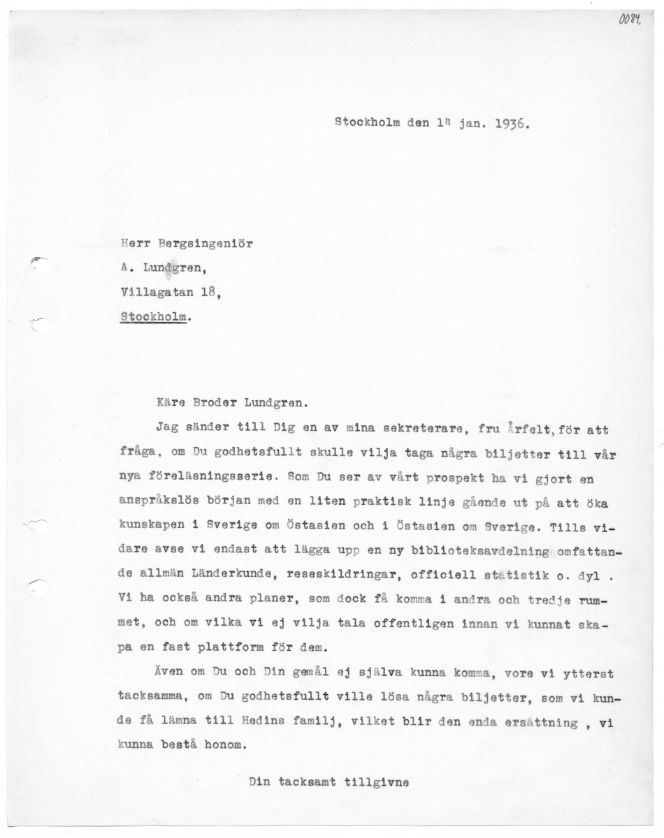 • O0M, Stockholm den 1 jan. 1936. Herr Bergsingeniör A. Lundgren, Villagatan 18, Stockholm. Käre Broder Lundgren, Jag sänder till Dig en av mina sekreterare, fru Årfelt, för att fråga, om Du godhetsfullt skulle vilja taga några biljetter till vår nya föreläsningsserie. Som Du ser av vårt prospekt ha vi gjort en anspråkslös början med en liten praktisk linje gående ut på att öka kunskapen 1 Sverige o... Visa hela