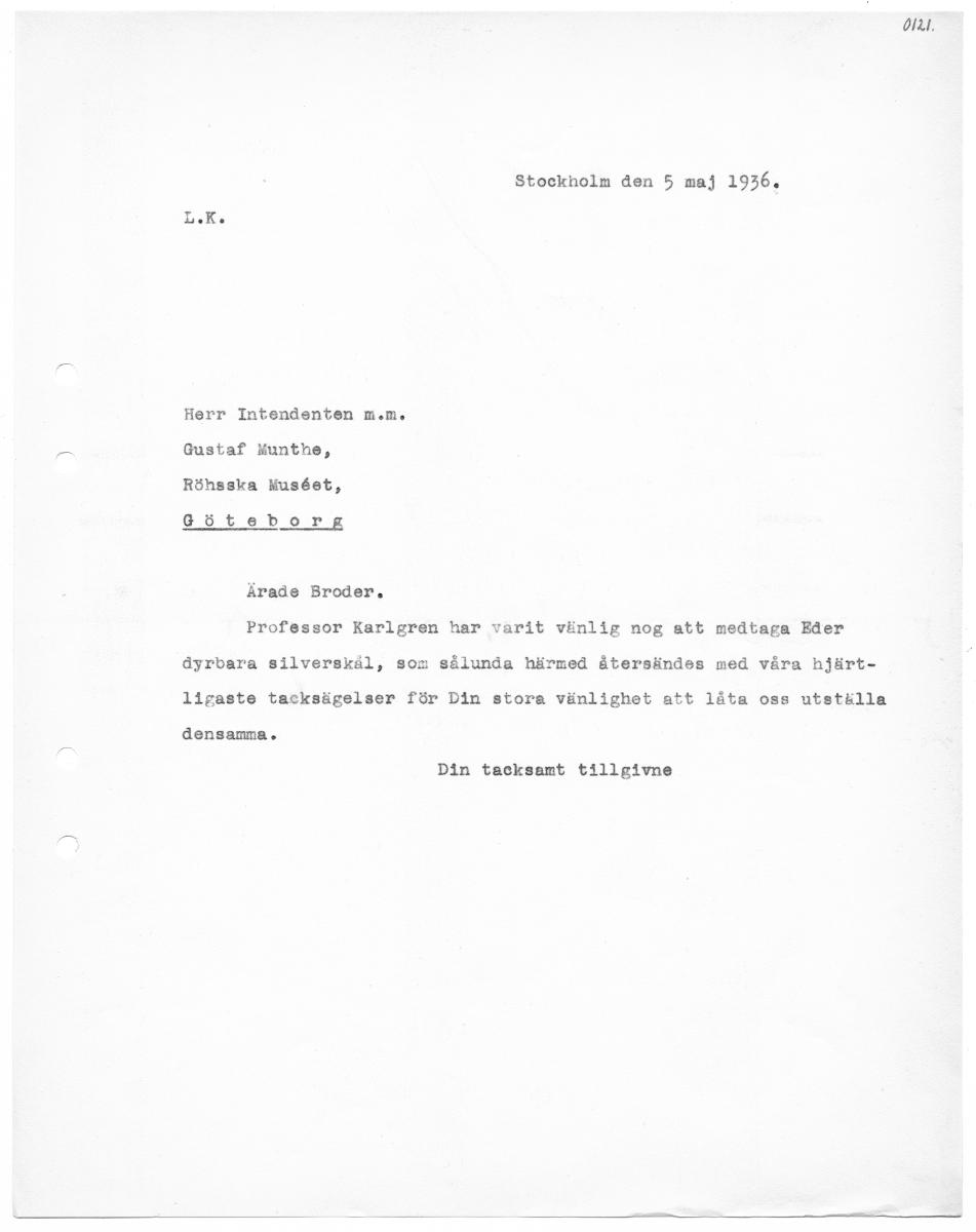 OM. Stockholm den 5 maj 1936. Herr Intendenten m.m. Gustaf Nunthe, Röhsska Nuséet, Göteborg Ärade Broder. Professor Karlgren har varit vänlig nog att medtaga Eder dyrbara silverskål, som sålunda härmed återsändes med våra hjärt- ligaste tacksägelser för Din stora vänlighet att låta oss utställa densamma . Din tacksamt tillgivne
