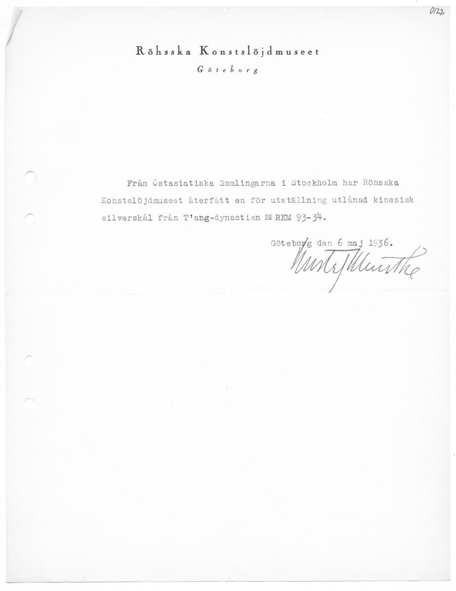 Omg Röhsska Konstslöjdmuseet Öserikers Från Östasiatiska Samlingarna 1 Stockholm har Röhsska Konstslöjämuseet återfått en för utställning utlånad kinesisk silverskål från T'ang-dynastien N2 REM 93-34. Göteboyg den 6 maj 1936. Umlifllatle
