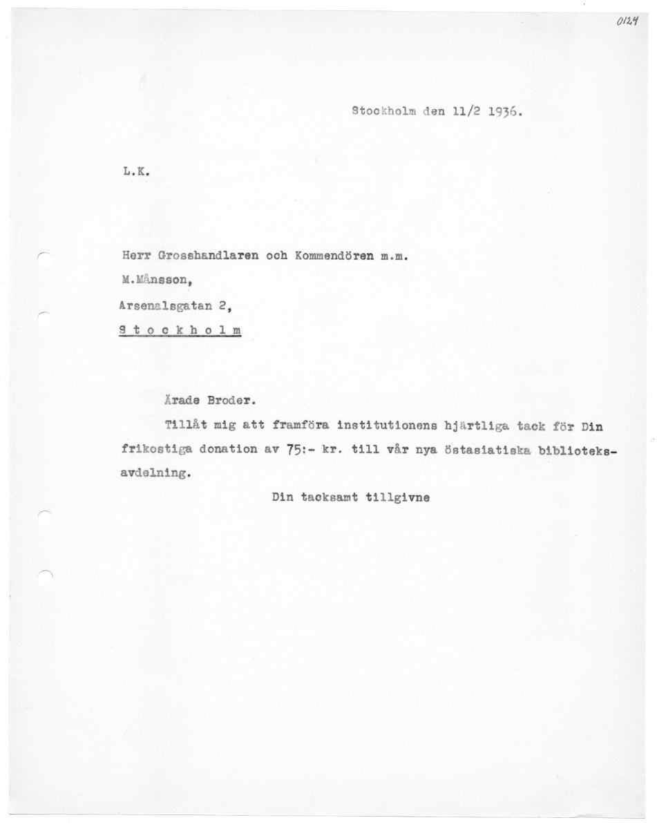 OM Stockholm den 11/2 1936. Herr Grosshandlaren och Kommendören m.m. M.Månsson, Arsenzlsgatan 2, Stockholm Ärade Broder. Tillåt mig att framföra institutionens hjärtliga tack för Din frikostiga donation av 75:- kr. till vår nya östasiatiska biblioteks- avdelning. Din tacksamt tillgivne