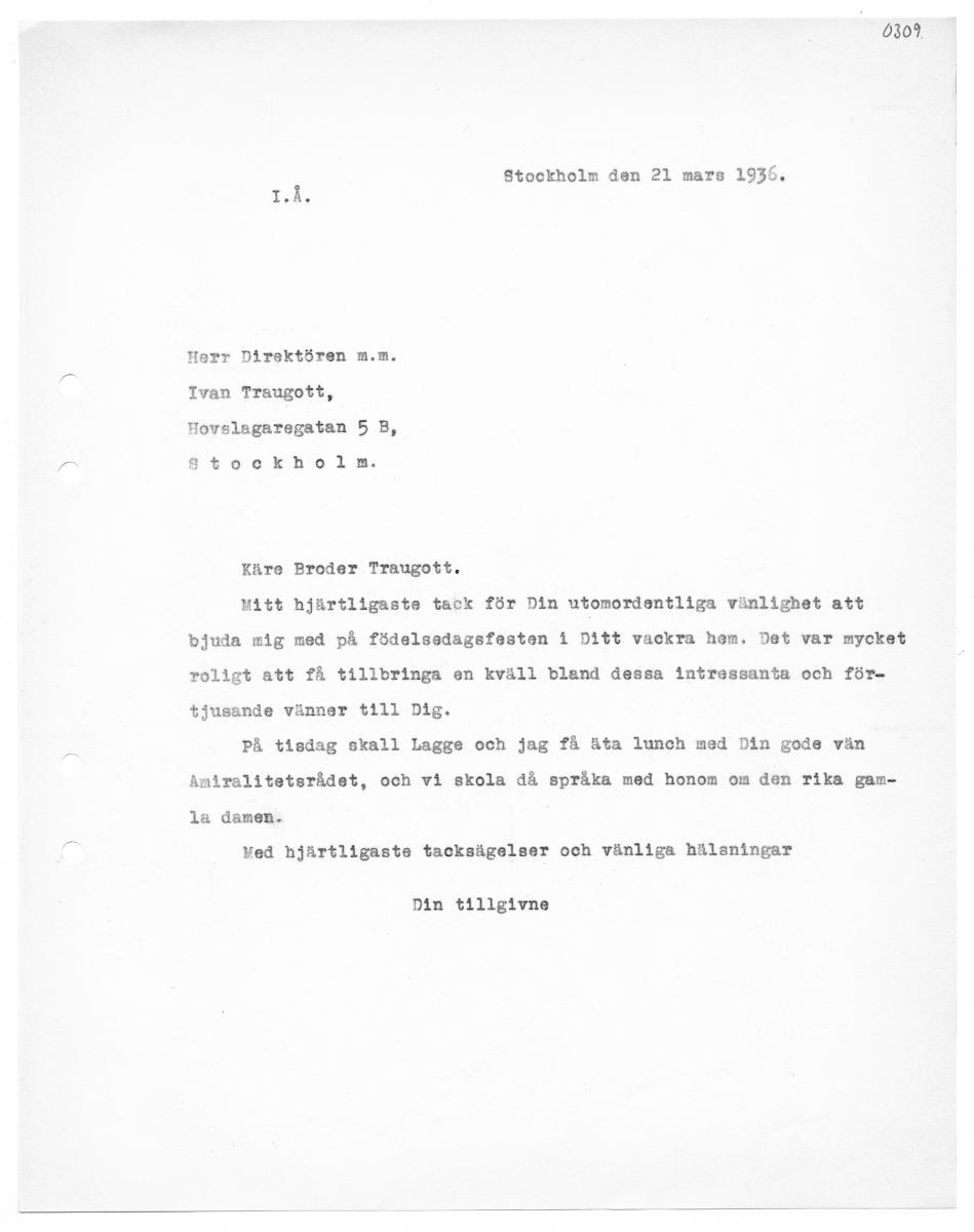 6309. å Stockholm den 21 mars 1936. I.Å, Herr Dirsktören m.m. Ivan Traugott, Hovslagaregatan 5 B, ftockholm Käre Broder Traugott. Nitt hjärtligaste tack för Din utomordentliga vänlighet att bjuda mig med på födelsedagsfesten i Ditt vackra hem, Det var mycket roligt att få tillbringa en kväll bland dessa intressanta och för. tjusande vänner till Dig. PÅ tisdag skall Lagge och jag få äta lunch med D...