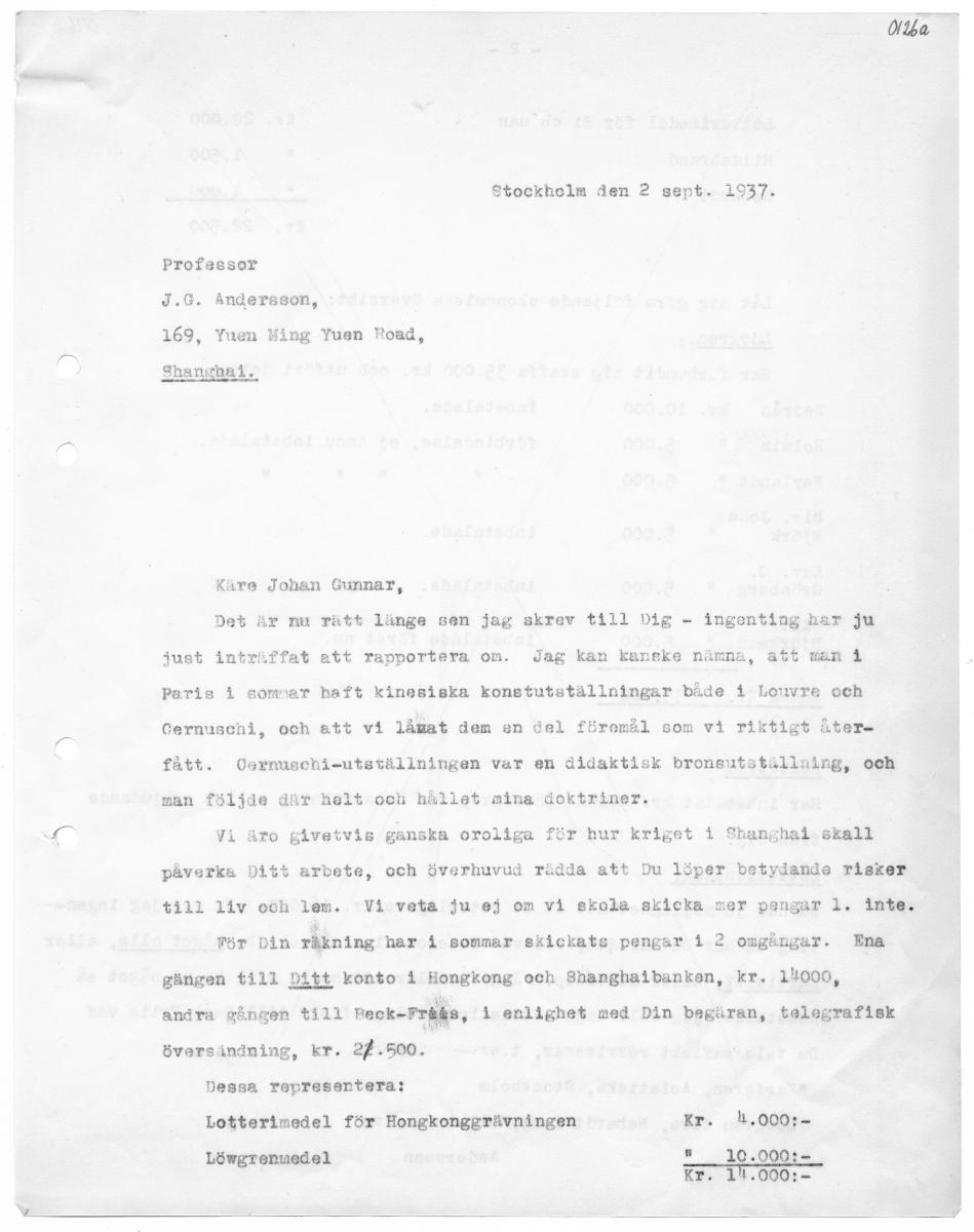 • Oda Stockholm den 2 sept. 1937. Professor J.G. Andersson, 169, Yuen Ming Yuen Road, Käre Johan Gunnar, Det är nu rätt länge sen jag skrev till Vig - ingenting har ju just inträffat att rapportera om. Jag kan kanske nämna, att wan 4 Paris i sommar haft kinesiska konetutställningar både 1 Louvre och Cernuschi, och att vi lånat dem en del föremål som vi riktigt åter. fått. Osrnuschi-utställningen var... Visa hela
