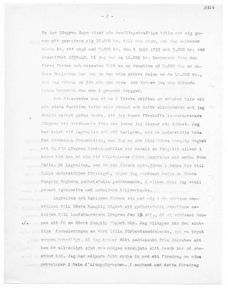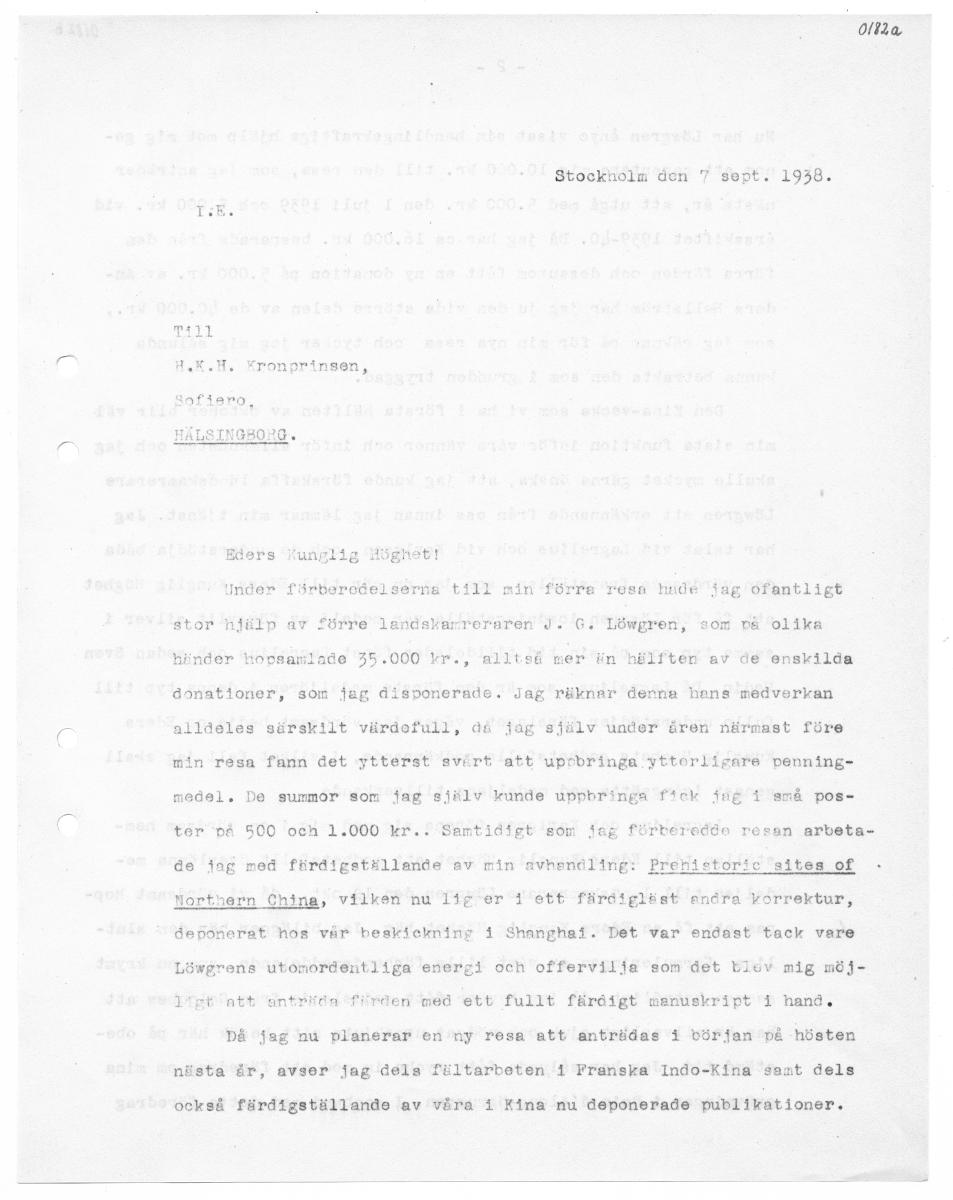 oft2a Stockholm den 7 sont. 1938. PEEE IKE, Kronprinsen, afiero, Eders Yungrig Höghevt under förbarstelserna till sin förra resa hudeé sag ofantligt stor hjälp av förre lendskarreraren J. G. Löwgren, som på olika händer bopsamlade 35.000 kr., mlltså mer in hölften av de enskilda donationer, som jag disponerade. Jag räknar derna hans medverkan alldeles särskilt värdofull, då jag själv under åren närmast före min resa fann det ytterst svirt att upsbringa yttorligare penning- medel. De summor som fag själv kunde uppbringa fick jig 1 små pos- tör på 500 och 1.000 kr.. Samtidigt som iag förberedde resan arbeta- de jag med färdigställande sv min avhandling: Prenistoric sites of « Northern China, vilken nu 1if er 1 ett färdiglöst endra Vorrektur, defonorat hos vår beskickning 1 Shanghai. Det var endast tack vare Löwgrens utomordentliga energi och offervilja som det E1dv mig möj- fön förden med ett fullt färdigt manuskript 1 hand. Då jag nu planerar en ny resa att antrödas 1 början på hösten nästa år, avser jag dela föltarbeten 1 Franska Indo-Kina samt dels också färdigställande av våra 1 Kina nu deponerade publikationer.