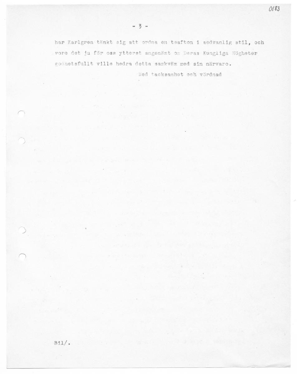 0183 Ze har Karlgren tänkt sig att ordna en tsafton 1 sedvanlig stil, och vore det fu för oas ytterst angenämt ax Deras Kungliga Sögheter gsochetafullt ville hedra detta samkvim med sin närvaro. Hed tacksemhat och vördnad B11/.