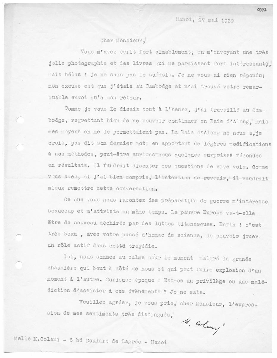 ae om Eäno1i, 37 mat 19889 cher Monsieur, Vous n”avez écrit fort aimablenent; en m'envoyant une trås jolie photographie et Jes livres oui me parsissent fort int£ressantg, mais hélas ! je ne sais pas le subdois. Je ne vous ai rien ripondu; mon excuse est aue j”étais au Cambodge et nail trouvå votre remar- ouable envoi qu”å mon retour. Comme je vous 1e disais tout å l”heure, jail travsill au Cam- bodge, regrettant bien de ne pouvoir continuer en Paie G Along, mais mes "oyens en me le permettaient pas, La Baie AAlon: ne nous a,je erois, pas dit son dernier mot; en apportant de légåres modifications å nos mithodes, peut-8tre aurions”nous nueloues surprises fécondes en résultats, Il fm irait discuter ses questions de vive voix, Comme vous avez, si j”ai bien compris, lintention de revsnir, il vandrait mnieuzx remettre cette conversation. Ce que vous nous racontez des priparatifs Je guerre m'intéresse beaucoup et m”attriste en måme temps. La pauvre Europe va-t-elle tre de nouveau déchirée par des luttes titanesouee. Enfin ! cest trös beau , avec votre paesé ä”homne de science, de pouvoir jouer un råle actif dans cettå tragédie. Ii, nous sommes au calme pour le moment malgré la grande ehaudiere qui bout å c8té de nous et qui pout faire explosion d'un moment å l'autse., Curieuse $poque ! Zst-ce un prifilige ou une malé- giction d' assister ä ces évånements ? Je ne sais. Vveuillez agréer, je vous prie, cher Monsieur, 1? expres- sion de mes sentidients trås distingués, Fear 4 Melle K.Colani — 3 ba Doudert de Lagrée - Hanoi