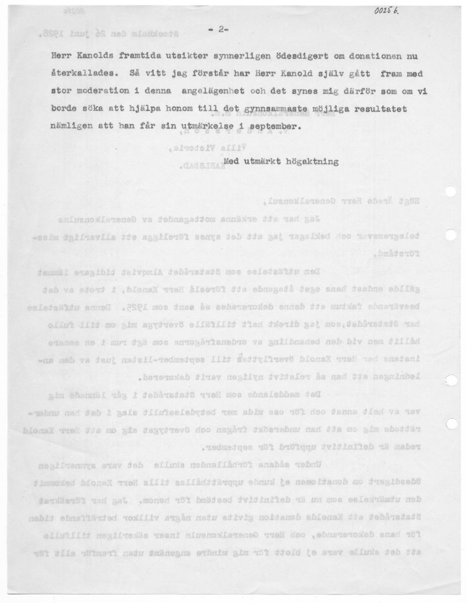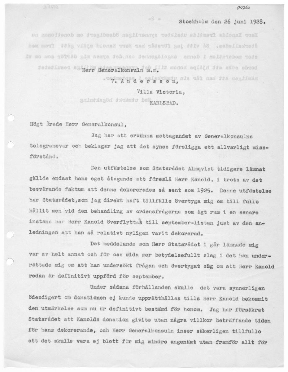 00252 Stockholm åen 26 juni 1928, Herr Heneralkönsuln m.m, CV kn oersson, Villa Victoria, KARLSBAD,. Högt Ärade Eerr Generalkonsul, Jag her att erkänna mottagandet av Generalkonsulna telegreamsvar och beklager jag att det synes föreligga ett allvarligt miss. förstånd, Den utfästelse som Statsrådet Almqvist tidigare lämnat gällde endast hans eget åtagande att föreslå Herr Kanold, i trots av det besvärande faktum att denne dekorerades så sent som 1925, Denna utfästelse her Statsrådet,som jag direkt haft tillfälle övertyga mig om till fullo hållit men vid den behandling av ordensfrågorna som ägt rum i en sönate instans har Herr Kanold överflyttas tilll september-listan just av den an- ledningen att han så relativt nyligen varit dekorerad. Det meddelande som Herr Statarådet i går lämnade mig var av helt annat och för oss mida mer betydalsafutit slag i det han under. rättade mig om att han undersökt frågan och övertygat stig om att Herr Kanold redan är definitivt uppförd för september, Under sådana förhållanden skulle det vara synnerligen ödesdigert om donationen ej kunde upprätthållas tills Herr Kanold bekommit den utmärkelse som nu är definitivt bestämd för honom, Jag har försäkrat Statsrådet att Kanolds donation givits uten några villkor beträffande tiden. för hans dekorerande, och Herr Generalkonsuln inser säkerligen tillfullo att det skulle vara ej blott för mig mindre angenämt utan framför allt för