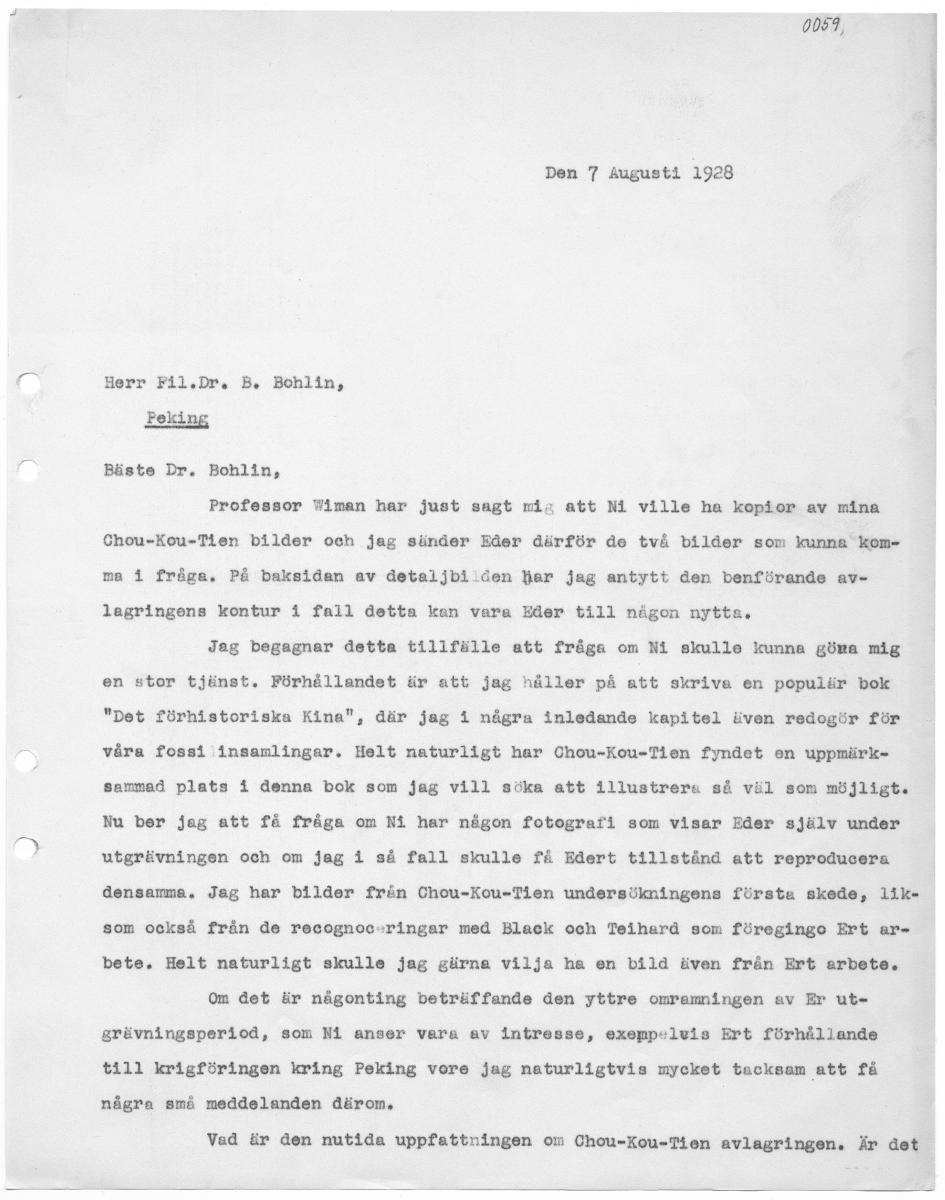0054, Den 7 Augusti 1928 Herr Fil.Dr,. B. Bohlin, Peking Bäste Dr. Bohlin, Professor Viman har just sagt mig att Ni ville ha kopior av mina Chou-Kou-Tien bilder och jag sänder Eder därför de två bilder som kunna kom- ma i fråga, På baksidan av detaljbiiden ler jag antytt den benförande av- lagringens kontur i fall detta kan vara Eder till någon nytta, Jag begagnar detta tillfälle att fråga om Ni skulle kunna göra mig en stor tjänst, Förhållandet är att jag håller på att skriva en populär bok "Det förhistoriska Kina", där jag 1 några inledande kapitel även redogör för våra fossi insamlingar. Helt naturligt har Chou-Kou-Tien fyndet en uppmärk=- sammad plats i denna bok som jag vill söka att illustrera så väl som möjligt Nu ber jag att få fråga om Ni har någon fotografi som visar Eder själv under utgrävningen och om jag i så fall skulle få Edert tillstånd att reproducera densamma. Jag har blider från Chou-Kou-Tien undersökningens första skede, 11 som också från de recognoc«ringar med Black och Teihardå som föregingo Ert ar bete, Helt naturligt skulle jag gärna vilja ha en bild även från Ert arbete. Om det är någonting beträffande den yttre omramningen av Er ut- grävningsperliod, som Ni anser vara av intresse, exempelvis Ert förhållande till krigföringen kring Peking vore jag naturligtvis mycket tacksam att få några små meddelanden därom, Vad är den nutida uppfattningen om Chou-Kou-Tien avlagringen. Är d