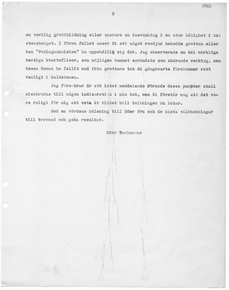 2060, en verklig grottbildning eller snarare en insvämning 1 en stor hålighet 1 kt stensberget., I förra fallet anser Nl att något roväjur bebodde grottan elle: kan "Pekingmänniskan" ha uppehållit sig där. Jag observerade en del märklig: kantiga kvartsflisor, som möjligen kunnat användats som skärande verktyg, me dessa kunna ha fallit ned från grottans tak då bi förekommer rätt vanligt i kalkstenen, Jag försikrar Er att intet meddelande förande dessa punkter skall missbrukas till någon indiskreticn i min bok, men Ni förstår nog att det vo. re roligt för mig att vete åt vilket håll tolkningen nu lutar. Med en vördsam hälsning till Eder fru och de bästa välönskningar till trevnad och goda resultat. Eder Facksamnme I | |