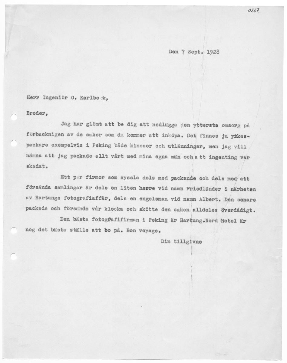OLER Den 7 Sept. 1928 Herr Ingeniör 0. Karlbe ck, "Broder, | Jag har glömt att be dig att nedlägga den yttersta omsorg på förbacknigen av de saker som du kommer att inköpa. Det finnes ju ybkes- packare exempelvis i Peking både kineser och utlänningar, men jag vilk nämna att jag packade allt vårt med mina egna män och a tt ingenting var skadat, = / Ett per firmor som syssla dels med packande och dels med, ett försända samlinger är dels en liten herere vid namn Friedländer 1 närkoten av Hartungs fotografiaffär, dels en engelsman vid namn Albert. Den senare packade och försände vår klocka och skötte den saken alldeles överdådigt. Den bästa fotogfafifirman i Peking är Hartung.Nord Hotel är nog det bästa ställe att bo på. Bon voyage, | Din tillgivne I