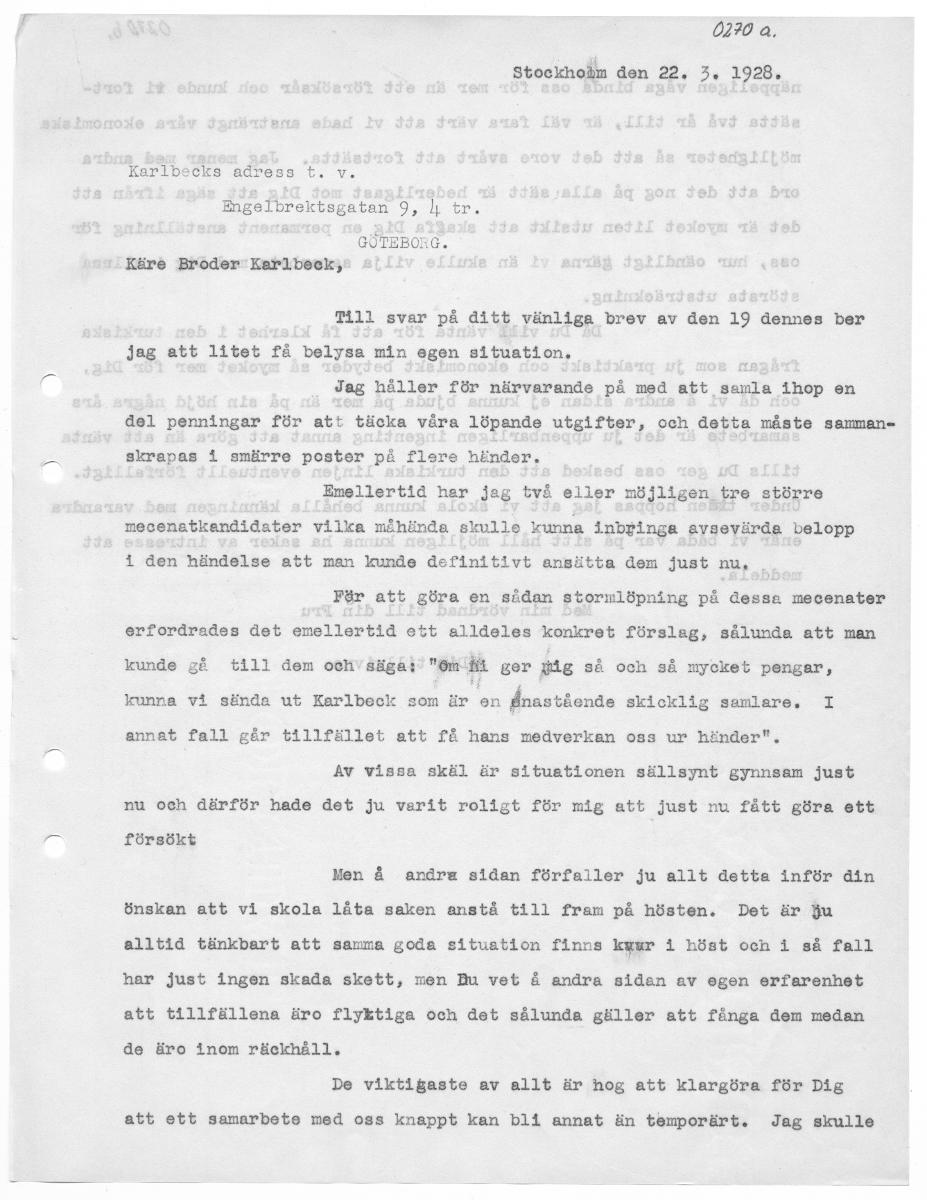 • 0220 a, Stockhodm den 22. 3. 1928. Karlbecks CROSS SL IGe Ve PG bPektsen ten ÖRE Zz GÖTEBORG. Käre Broder Karlbeeky Till svar på ditt vänliga bröt Av den 19 dennes ber jag att litet få belysa min egen... Visa hela