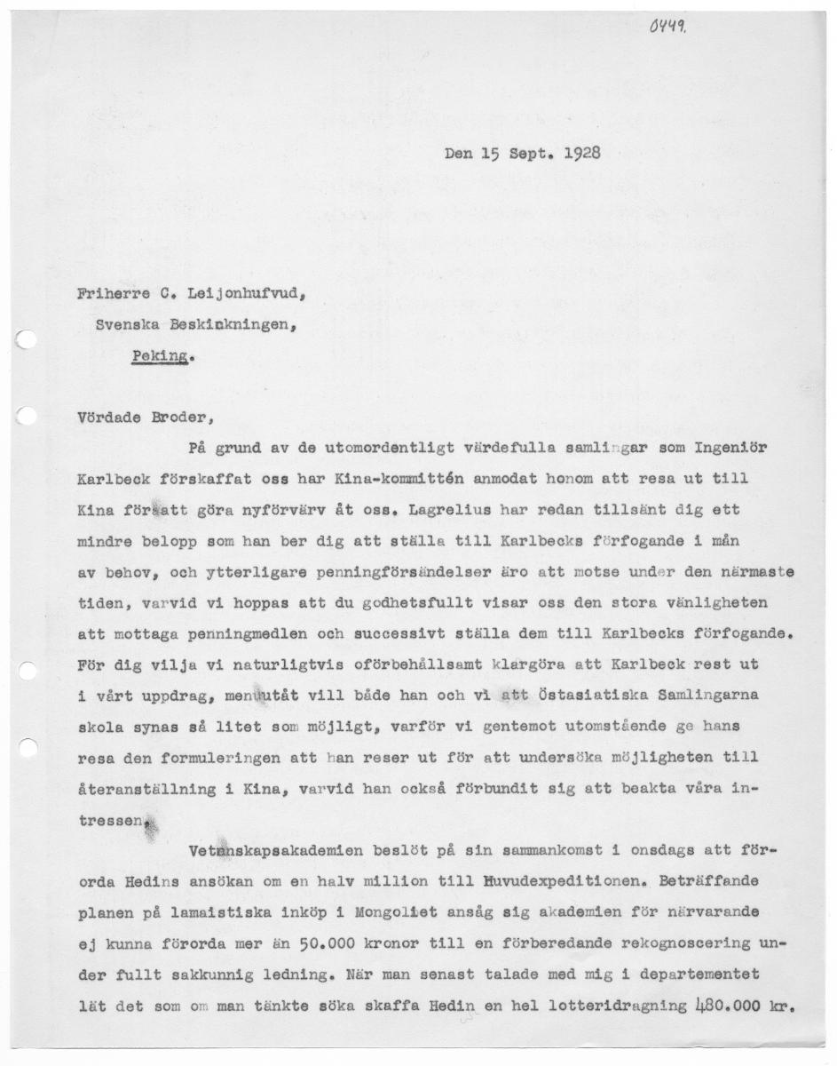 0449, Den 15 Sept. 1928 Friherre C, Leijonhufvud, Svenska Beskinkningen, Pekings. Vördade Broder, På grund av de utomordentligt värdefulla samlingar som Ingenjör Karlbeck förskaffat oss har Kina-kommittén anmodat honom att resa ut till Kina förkatt göra nyförvärv åt oss, Lagrelius har redan tillsänt dig ett mindre belopp som han ber dig att ställa till Karlbecks förfogande i mån av behov, och ytterligare penningförsändelser äro att motse under den närmaste tiden, varvid vi hoppas att du godhetsfullt visar oss den stora vänligheten att mottaga periningmedlen och successivt ställa dem till Kerlbecks förfogande. För dig vilja vi naturligtvis oförbehållsamt klargöra att Karlbeck rest ut i vårt uppdrag, menilutåt vill både han och vi att Östasiatiska Samlingarna skola synas så litet som möjligt, varför vi gentemot utomstående ge hans resa den formuleringen att han reser ut för att undersöka möjligheten till återanställning i Kina, varvid han också förbundit sig att beakta våra in- tresseng, 2 Vetgnskapsakademien beslöt på sin sammankomst i onsdags att för- orda Hedins ansökan om en halv million till Huvudexpeditionen. Beträffande planen på lamailstiska inköp 1 Mongoltet ansåg sig akademien för närvarande. ej kunna förorda mer än 50.000 kronor till en förberedande rekognoscering un= der fullt sakkunnig ledning. När man senast talade med mig 1 departementet lät det som om man tänkte söka skaffa Hedin en hel lotteridragning lj80.000 kr.