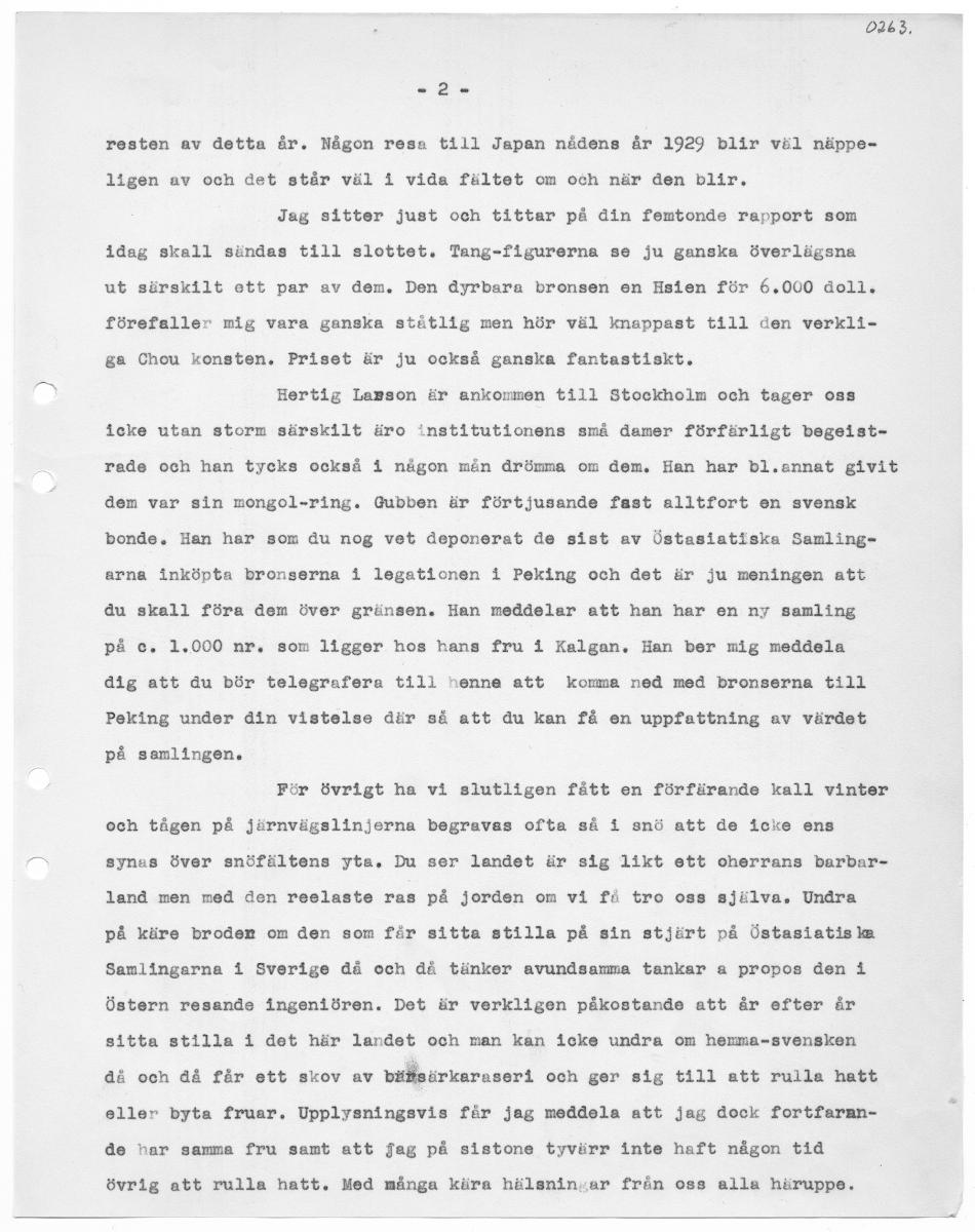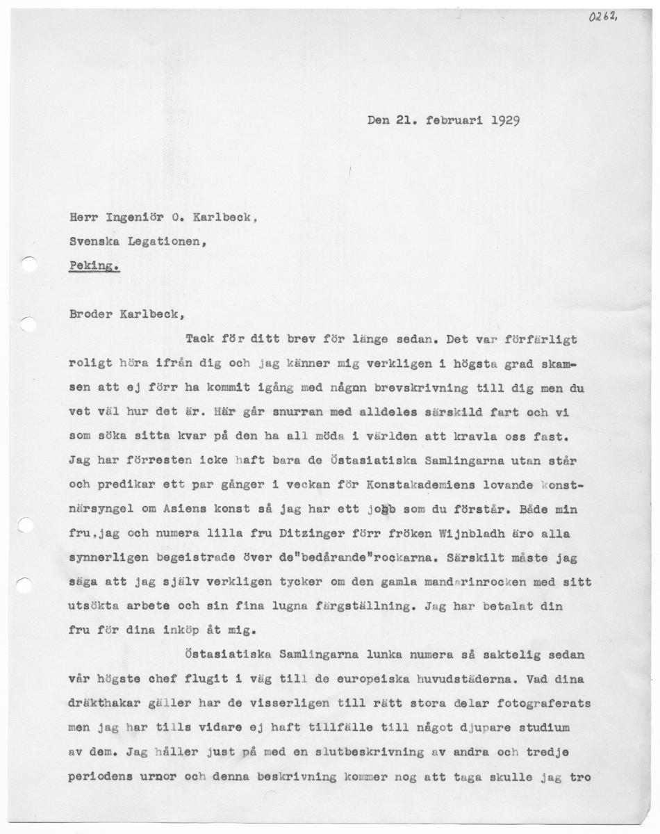 0262, Den 21. februari 1929 Herr Ingeniör 0, Karlbeck, Svenska Legationen, Peking, Broder Karlbeck, Tack för ditt brev för länge sedan. Det var förfärligt roligt höra ifrån dig och jag känner mig verkligen 1 högsta grad skam. sen att ej förr ha kommit igång med någon brevskrivning till dig men du vet väl hur det är. Här går snurran med alldeles särskild fart och vi som söka sitta kvar på den ha all möda i världen att kravla oss fast. Jag har förresten icke haft bara de Östasiatiska Samlingarna utan står och predikar ett par gånger i veckan för Konstakademiens lovande konst- närsyngel om Asiens konst så jag har ett joljb som du förstår. Både min fru,jag och numera lilla fru Ditzinger förr fröken Wijnbladh äro alla synnerligen begeistrade över de"bedårande"rockarna.,. Särskilt måste jag säga att jag själv verkligen tycker om den gamla mandsrinrocken med sitt utsökta arbete och sin fina lugna fäörgställning. Jag har betalat din fru för dina inköp åt mig. Östasiatiska Samlingarna lunka numera så saktelig sedan vår högste chef flugit i väg till de europeiska huvudstäderna. Vad dina dräkthakar gäller har de visserligen till rätt stora delar fotograferats men jag har tills vidare ej haft tillfälle till något djupare studium av dem. Jag håller just på med en slutbeskrivning av andra och tredje periodens urnor och denna beskrivning kommer nog att taga skulle jag tro
