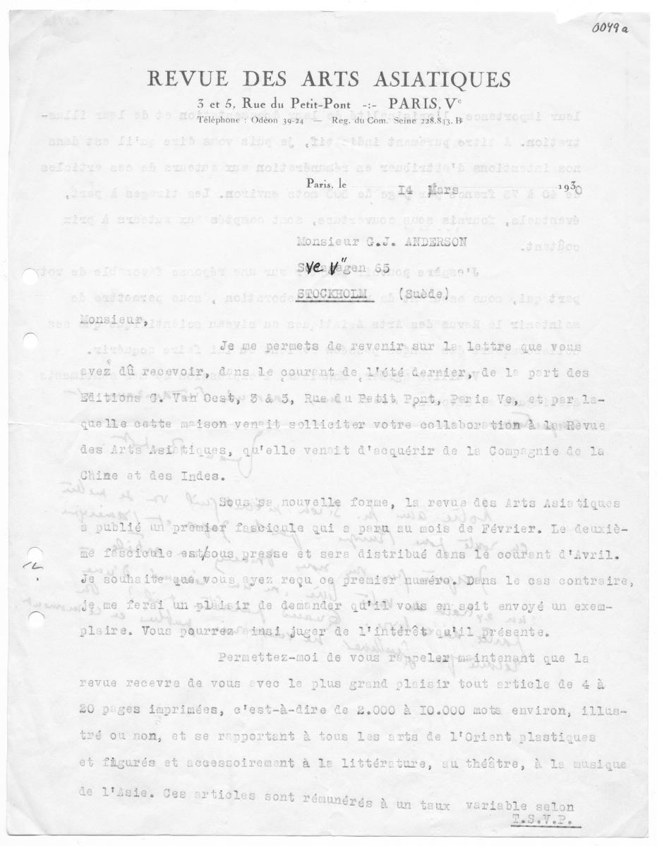 « Ö079 a REVUE DES ARTS ASITATIQUES 3 et 5, Rue du Petit-Pont -:- PARIS, VE Telephone : Odéon 39-24 — Reg. du Com. Seine 228.813. B Paris, le 14 Hars = ä 930) t Monsieur GÅ.J. ANDERSON u / Syezfkgen. ...