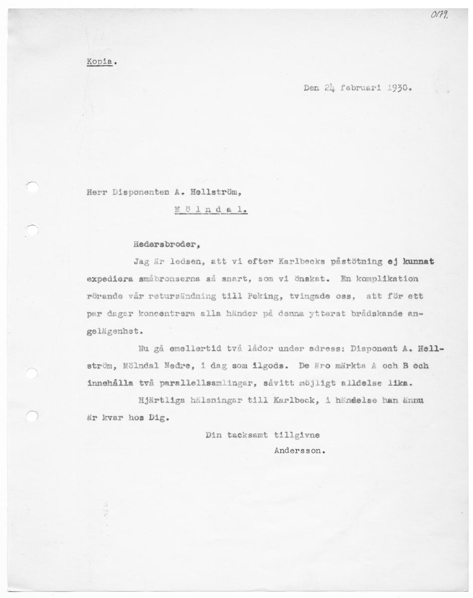 NN OO? Kopia. Den 24 februari 1930. Herr Disponenten A. Hellström, KK öl ndAR ll, Hedersbroåer, Jag är ledsen, att vi efter Karlbecks påstötning ej kunnat expediera småbronserna så snert, som vi önskat. En komplikation rörande vår retursändning till Peking, tvingade oss, att för ett par degar koncentrera alla händer på denna ytterst brådskande an- gelägenhet. Ha gå emellertid två lådor under adress: Disponent A. Hell- ström, Mölndal Nedre, 1 dag som 11lgoäs. De äro märkta A och B öch innehålla två parallellsamlingar, såvitt möjligt alldelse lika. Hjärtliga hälsningar till Kerlbeck, i händelse han ännu är kvar hos Dig. Din tacksamt tlllgivne Andersson.