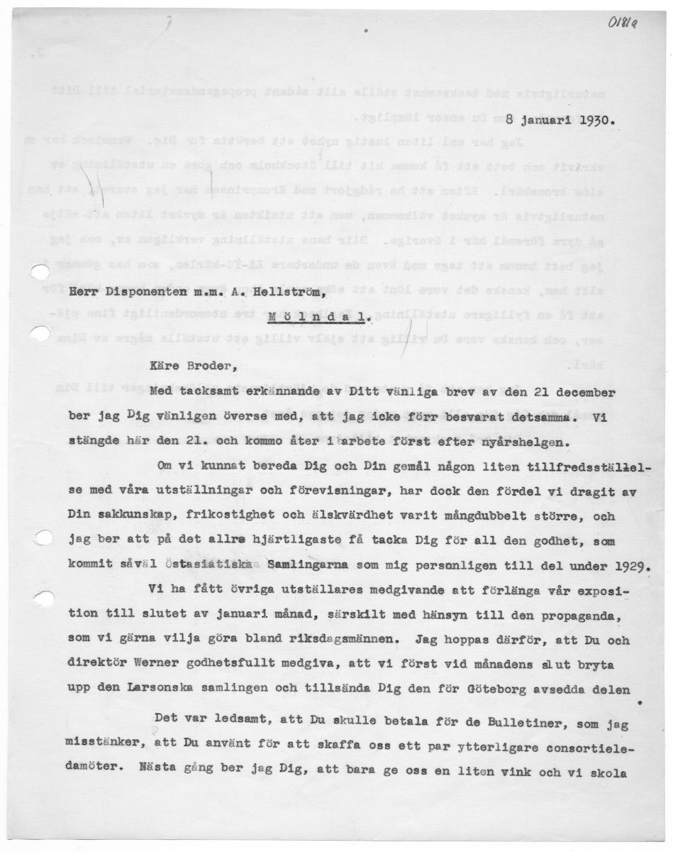Ölu«u? 8 januari 1930. Herr Disponentenr m.m. A. Hellström, Mölndal. Käre Broder, Med tacksamt erkännande av Ditt vänliga brev av den 21 december ber jag Dig vänligen överse med, att jag icke förr besvarat detsamma. Vi stängde här den 21. och kommo åter 1itarbete först efter nyårshelgen. Om vi kunnat bereda Dig och Din gemål någon liten tillfredsställel- se med våra utställningar och förevisningar, har dock den fördel vi dragit av Din sakkunskap, frikostighet och älskvärdhet varit mångdubbelt större, och jag ber att på det allre hjärtligaste få tacka Dig för all den godhet, som kommit såväl Östasiatiska. Samlingarna som mig personligen till del under 1929, Vi ha fått övriga utställares medgivande att förlänga vår exposi- tion till slutet av januari månad, särskilt med hänsyn till den propaganda, som vi gärna vilja göra blend riksdegsmännen. Jag hoppas därför, att Du och direktör Werner godhetsfullt medgiva, att vi först vid månadens slut bryta upp den Larsonska samlingen och tillsända Dig den för Göteborg avsedda delen Det var ledsamt, att Du skulle betala för de Bulletiner, som jag misstänker, att Du använt för att skaffa oss ett par ytterligare eonsortiele- damöter. Nästa gång ber jag Dig, att bara ge oss en liten vink och vi skola