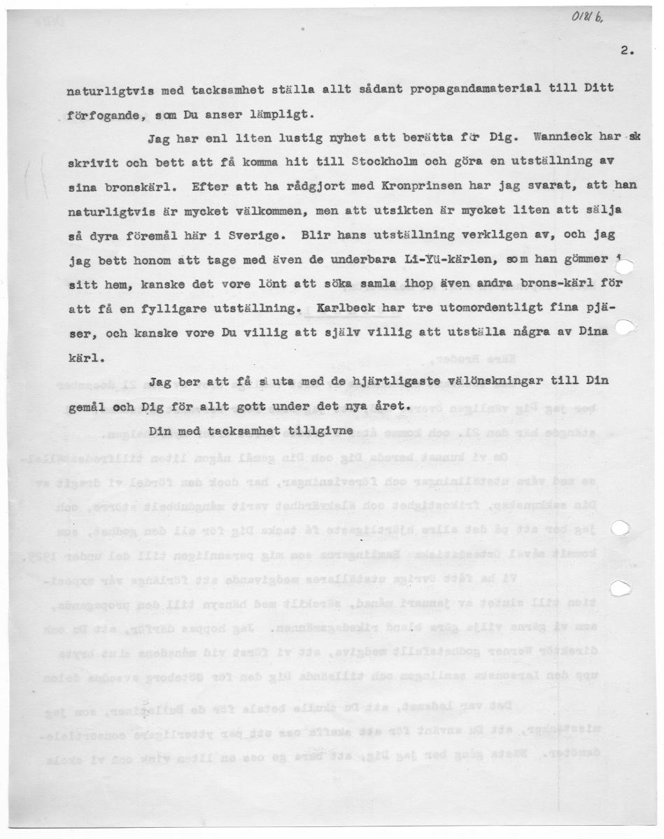 OM b, naturligtvis med tacksamhet ställa allt sådant propagandamaterial till Ditt förfogande, som Du anser lämpligt. Jag har enl liten lustig nyhet att berätta fir Dig. Wannieck har -sk skrivit och bett att få komma hit till Stockholm och göra en utställning av sina bronskärl. Efter att ha rådgjort med Kronprinsen har jag svarat, att han naturligtvis är mycket välkommen, men att utsikten är mycket liten att sälja så dyra föremål här i Sverige. Blir hans utställning verkligen av, och jag jag bett honom att tage med även de underbara Li-Yuä-kärlen, som han gömmer 3— sitt hem, kanske det vore lönt att söka samla ihop även andra brons-kärl för att få en fylligare utställning. Karlbeck har tre utomordentligt fina pjä- ser, och kanske vore Du villig att själv villig att utställa några av Dina & kärl. E Jag ber att få s uta med de hjärtligaste välönskningar till Din gemål och Dig för allt gott under det nya året. Din med tacksamhet tillgivne