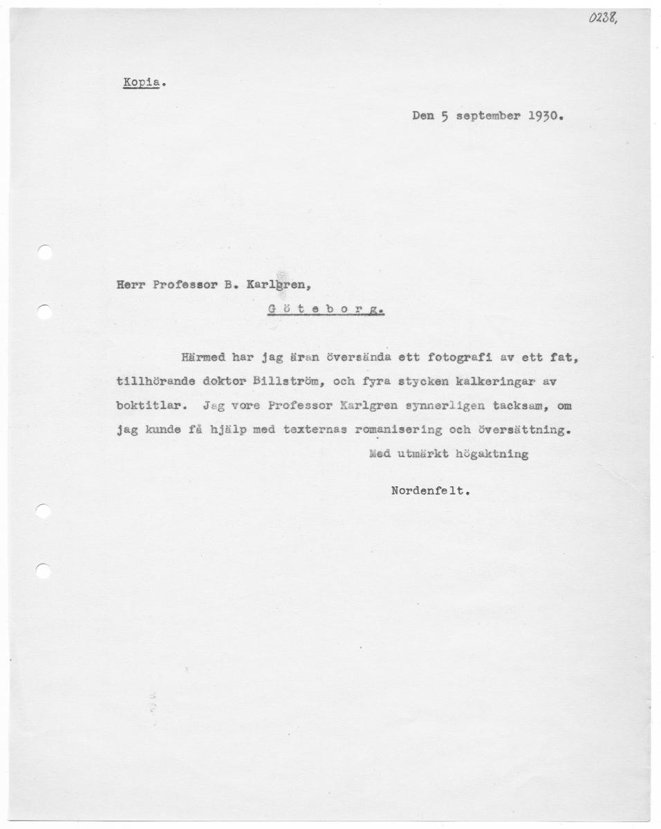 • 0288, Kopia. Den 5 september 1930. Herr Professor B. Karlbren, göteborg Härmed har jeg äran översända ett fotografi av ett fat, tillhörande doktor Billström, och fyra stycken kalkeringar av boktitlar. Jeg vore Professor Karlgren synnerligen tacksam, om jag kunde få hjälp med texternas romanisering och översättning. Hed utmärkt högaktning Nordenfelt.