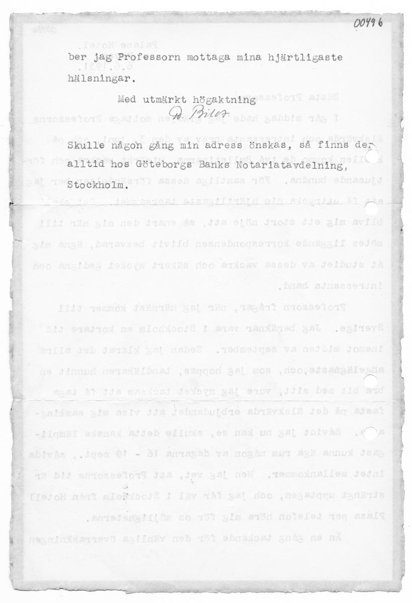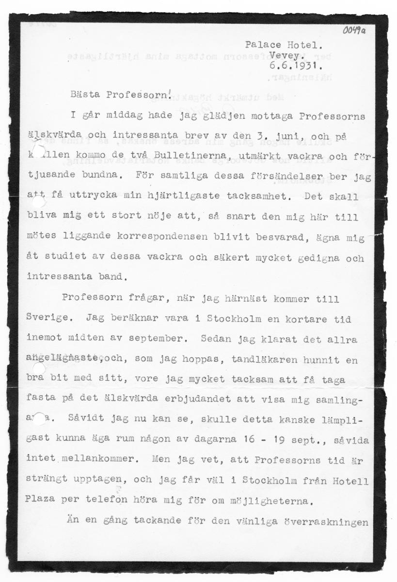 Palace Hotel. Vevey. Or: 1931, slädjen mottaga Professorns Lskvärda och intressanta brev av den 3, juni, och på ullen kommo de två Bulletinerna, utmärkt vackra och mm . i För samtliga dessa försändels ber amhet., Det stort nöje att, så snart den mig ande korrespondensen blivit besvarad, åt studiet av dessa vackra och säkert mycket intressanta band, Professorn frågar, beräknar vara i Stockholm en k...