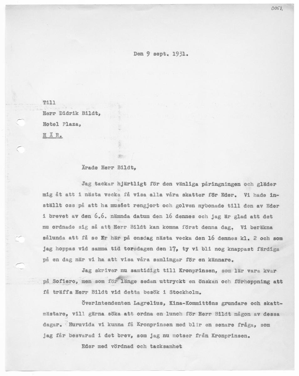 • 005 3, Den 9 sept. 1931. P411 Herr Didrik Bildt, Hotel Plaza, HÄR, Ärade Herr Bildt, Jag tackar hjärtligt för den vänliga påringningen och gläder mig åt att i nästa vecka få visa alla våra skatter för Eder, Vi hade in- ställt oss på att ha malet rengjort och golven nybonade till den av Eder 1 brevet av den 6.6, nämnda datum den 16 dennes och jag är glad att det nu ordnade sig så att Herr Bildt kan... Visa hela