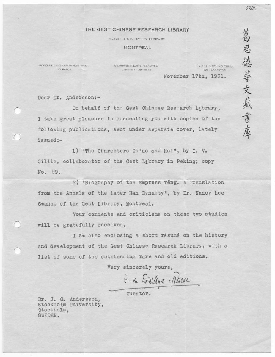 O2D0I, THE GEST CHINESE RESEARCH LIBRARY MEGILL UNIVERSITY LIBRARY & MONTREAL ROBERT DE RESILLAC-ROESE,PH.D., GERHARD R.LOMER,M.A.,PH.D., I.V.GILLIS, PEKING, CHINA. ' CURATOR UNIVERSITY LIBRARIAN COLLABORATOR November l7th, 1931. <A Au SE 3 st we FR Dear Dr. Andersson:- On behalf of the Gest Chinese Research Library, ak I take great pleasure in presenting you with copies of the following publicati...