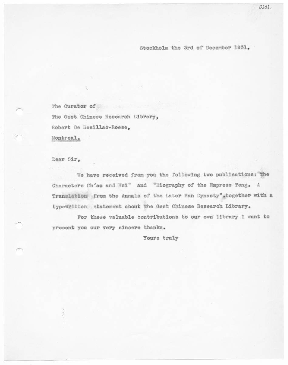 • 0202. / Stockholm the 3rd of December 1931. / The Curator of / The Gest Chinese Kesearch Library, / Robert De Resillac-Roese, / Montreal. / Dear Sir, / We have received from you the following two publications:"Ehe Characters Ch`ao and Hsi" and "Biography of the Empress Teng, A Translation from the Annals of the Later Han Dynasty" together with a typewritten statement about The Gest Chinese Researc... Visa hela