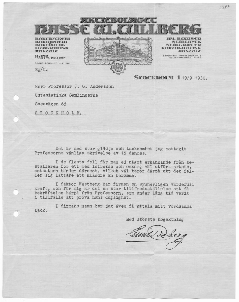 OdET c (0LTTLL BASSE TI.COLLBERG BORCRYCKERI FIVYL RECAAS Ca BOKBIPDERI STAHLCRYCK BOKFÖRLAG .SCALGRAVYVYR ILICOGRAFISK KAR COGRIAFISK ARSCHLC FIND STCALC TELEFON: SZTOCKROLM »« KURGSBRÖPLANR 3 ”RASSE VW. ZULLBERG” TELEGRAMADRESS: RASSE POSZGIROKONZO PR:R SO7 Bg/L. SCOCKROLM I 19/9 1932. Herr Professor J., G. Andersson Östasiatiska Samlingarna Sveavägen 65 Sar O CC -E- HOLM; Det är med stor glädje...Visa hela