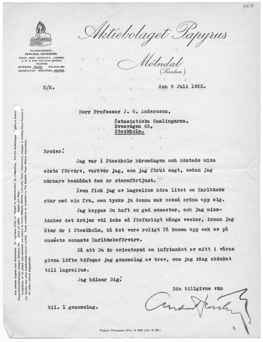417 Bets ISEN En TELEGRAFADRESS: PAPYRUS, GÖTEBORG. CODES USED: BENTLEY'S, LIEBERS, - Å A. B. C. 5:TH OCH 6:TH EDITION. - t ”” TELEFON: GÖTEBORG 73030 MÖLNDAL 584 : GODSSTATION: MÖLNDAL NEDRE. 5S UUe0lle?t. i H/M. ; den 9 Juli 1932. ) Herr Professor J. G. Andersson, Östasiatiska Samlingarna, Sveavägen 65, Stockholm. ! gälla av Svensk Broder: Jag var i Stockholm häromdagen och hämtade mina sista fö...