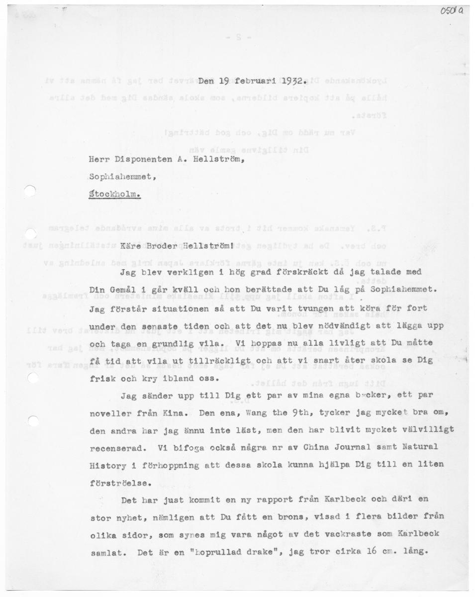 osva Den 19 februari 1932. Herr Disponenten A. Hellström, Sophiahemmet, Stockholm. Käre Broder Hellström! Jag blev verkligen 1 hög grad förskräckt då jag talade med Din Gemål 1 går kväll och hon berättade att Du låg på Sophiahemmet. Jag förstår situationen så att Du varit tvungen att köra för fort under den senaste tiden och att det nu blev nödvändigt att lägga upp och taga en grundlig vila. Vi hoppas nu alla livligt att Du måtte | få tid att vila ut tillräckligt och att vi snart åter skola se Dig i : frisk och kry ibland oss. Jag sänder upp till Dig ett par av mina egna b-cker, ett par noveller från Kina. Den ena, Wang the YIYth, tycker jag mycket bra öns den andra har jag ännu inte läst, men den har blivit mycket välvilligt recenserad. Vi bifoga också några nr av China Journal samt Natural History i förhoppning att dessa skola kunna hjälpa Dig till en liten förströelse. Det har just kommit en ny rapport från Karlbeck och däri en stor nyhet, nämligen att Du fått en brons, visad 1 flera bilder från olika sidor, som syres mig vara något av det vackraste som Karlbeck samlat. Det är en "boprullad drake", jag tror cirka 16 em. lång.