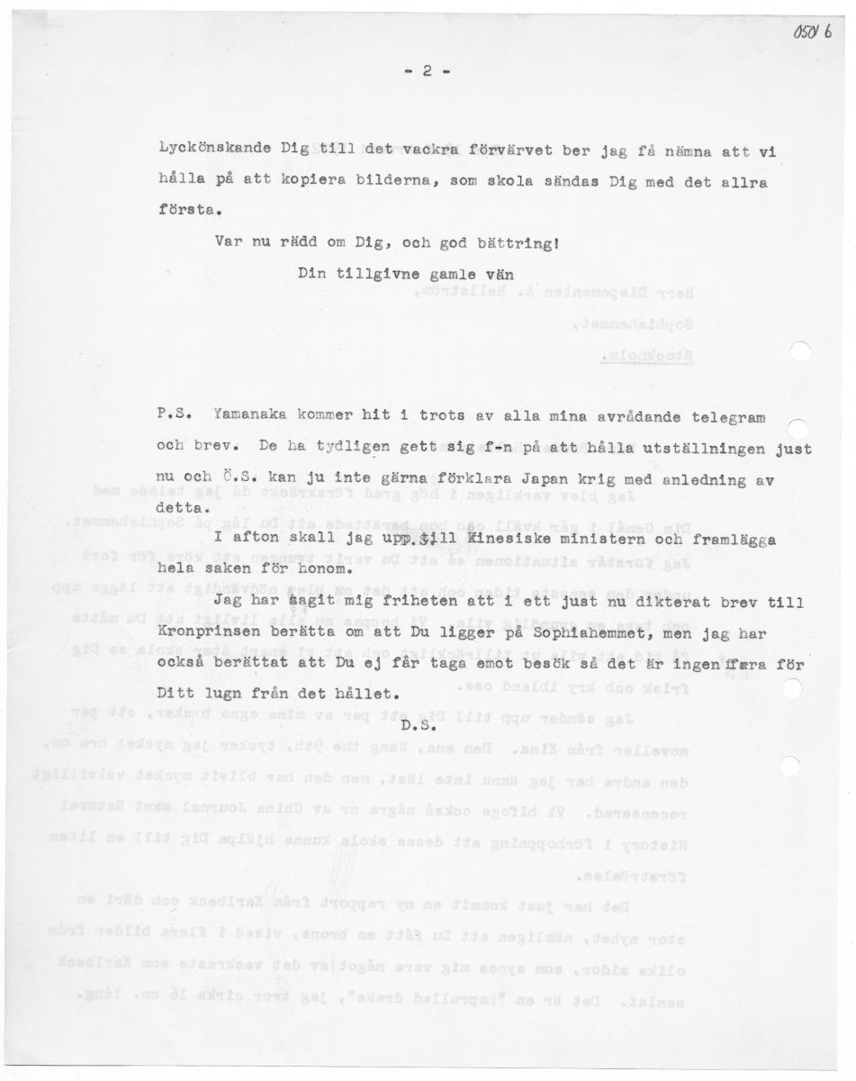 sb Lyckönskande Dig till det vackra förvärvet ber jag få nämna att vi hålla på att kopiera bilderna, som skola sändas Dig med det allra första. Var nu rädd om Dig, och god bättring! Din tillgivne gamle vän P.S, Yamanaka kommer hit i trots av alla mina avrådande telegram — och brevs De ha tydligen gett sig f-n på att hålla utställningen just nu och Ö.S. kan ju inte gärna förklara Japan krig med anledning av detta. I afton skall jag upp, $il1l kinesiske ministern och framlägga hela saken för Lonom. Jag har bagit mig friheten att i ett just nu dikterat brev till Kronprinsen berätta om att Du ligger på Sophiahemmet, men jag har också berättat att Du ej får taga emot besök så det är ingen ffera för Ditt lugn från det hållet. D, 5,