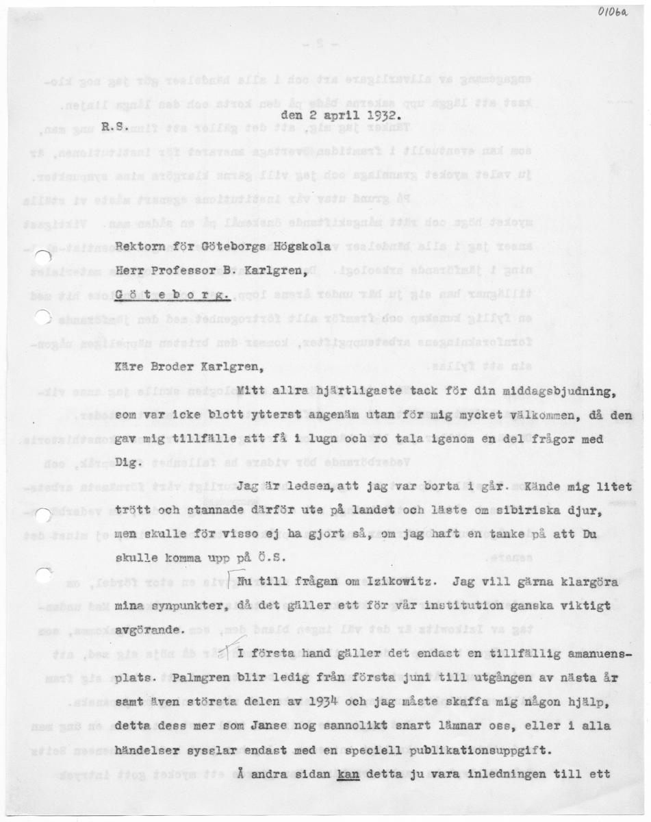 Ol0ba den 2 april 1932, a Rektorn för Göteborgs Högskola Herr Professor B. Karlgren, Göteborg. Käre Broder Karlgren, Mitt allra hjärtligaste tack för din middagsbjudning, som var icke blott ytterst angenäm utan för mig mycket välkommen, då den gav mig tillfälle att få i lugna och ro tala igenom en del frågor med Dig. Jag är ledsen, att jag var borta i går. Kände mig litet trött och stannade därför ute på landet och läste om sibiriska djur, nen skulle för visso ej ha gjort så, om jag haft en tanke på att Du skulle komma upp på Ö.8. | | mu till frågan om Izikowitz. Jag vill gärna klargöra mina synpunkter, då det gäller ett för vår institution ganska viktigt avgörande. |; : ÅA I företa hand gäller det endast en tillfällig amanuens- plats. Palmgren blir ledig från första juni till utgången av nästa år samt även största delen av 1934 och jag måste skaffa mig någon hjälp, detta dess mer som Janse nog sannolikt snart lämnar oss, eller i alla händelser syselar endast med en speciell publikationsuppgift. Å andra sidan kan detta ju vara inledningen till ett